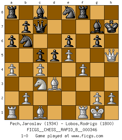 Last move : 1-0 2020 August 8 23:2:3 [Event "FICGS__CHESS__RAPID_B__000346"] [Site "FICGS"] [Date "2020.06.14"] [Round "1"] [White "Pech,Jaroslav"] [Black "Lobos,Rodrigo"] [Result "1-0"] [WhiteElo "1934"] [BlackElo "1800"] 1.e4 d6 2.d4 Nd7 3.f4 c5 4.d5 g6 5.Nf3 Bg7 6.c4 Qc7 7.Bd3 Ngf6 8.Nc3 a6 9.Qe2 O-O 10.O-O e5 11.dxe6 fxe6 12.Ng5 Nb6 13.a4 d5 14.e5 Ne8 15.Nxh7 Kxh7 16.Qh5+ 1-0 King's pawn Opening Kingside Castling by player Black (move 9) Kingside Castling by player White (move 10) Player White won this chess game. Follow this game move after move (download)Why must I lose to this idiot ? (Aron Nimzovich) Es gibt zwei Arten von Opfern: Korrekte und meine. (Mikhail Nekhemyevich Tal) Yo jugué Ajedrez con el y a veces le pude haber ganado solo que siempre devuelve su última jugada y juega la partida de manera diferente. (Mark Twain) Je ne crois pas en la psychologie, je crois aux bons coups. (Robert Fischer) Never was anything great achieved without danger. (Niccolo Machiavelli)