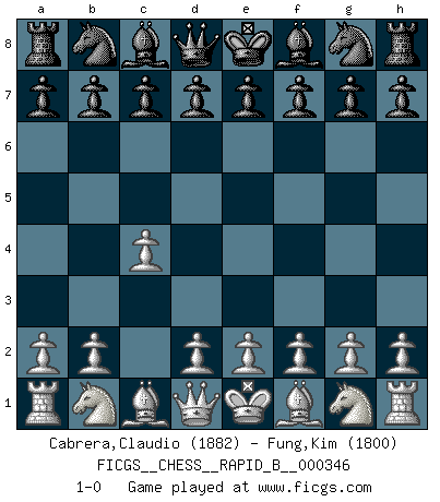 Last move : 1-0 2020 July 14 21:16:3 [Event "FICGS__CHESS__RAPID_B__000346"] [Site "FICGS"] [Date "2020.06.14"] [Round "1"] [White "Cabrera,Claudio"] [Black "Fung,Kim"] [Result "1-0"] [WhiteElo "1882"] [BlackElo "1800"] 1.c4 1-0 This chess game has been lost on time (started : 2020.06.14 15:23:15) English Opening Player White won this chess game. Follow this game move after move (download)By playing at Chess then, we may learn: First: Foresight... Second: Circumspection... Third: Caution... And lastly, we learn by Chess the habit of not being discouraged by present bad appearances in the state of our affairs, the habit of hoping for a favorable chance, and that of persevering in the secrets of resources. (Benjamin Franklin) Alle Schachspieler sollten auch ein Hobby haben. (Savielly Grigorievitsch Tartakower) Solo el jugador con la iniciativa tiene el derecho a atacar. (Wilhelm Steinitz) Mon pion favori sur ma case favorite ! Bronstein en parlant d'un coup de pion en h5 quand il avait les Noirs. We're missing something. (Gregory House, House M.D.)