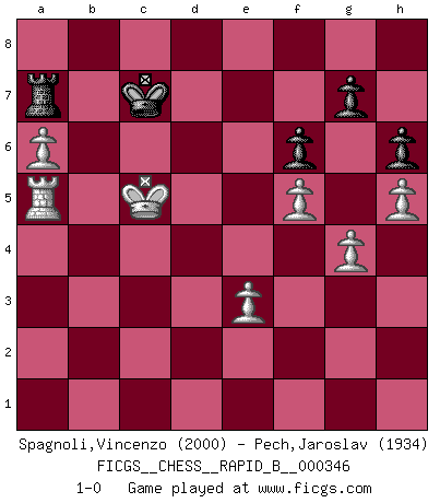 Last move : 1-0 2020 December 11 0:41:40 [Event "FICGS__CHESS__RAPID_B__000346"] [Site "FICGS"] [Date "2020.06.14"] [Round "1"] [White "Spagnoli,Vincenzo"] [Black "Pech,Jaroslav"] [Result "1-0"] [WhiteElo "2000"] [BlackElo "1934"] 1.d4 Nf6 2.Nf3 d5 3.e3 e6 4.Bd3 c5 5.b3 Nc6 6.O-O Bd6 7.Bb2 O-O 8.Nbd2 b6 9.a3 Bb7 10.dxc5 bxc5 11.c4 h6 12.Qc2 Re8 13.Rfe1 Nd7 14.Rad1 Qe7 15.h3 Nce5 16.Nxe5 Nxe5 17.Bf1 Qc7 18.Qc3 f6 19.cxd5 exd5 20.f4 Nf7 21.Qc2 c4 22.Nf3 c3 23.Bc1 Bf8 24.Bd3 Nd6 25.Bg6 Rec8 26.Rd3 a5 27.Nh4 Ne4 28.Kh2 Qb6 29.Red1 Rc7 30.Rxd5 Bxd5 31.Rxd5 Nc5 32.Bh7+ Kh8 33.Bf5 Kg8 34.Qxc3 Qxb3 35.Qd4 Re8 36.Bd2 Qa4 37.Qa1 Qb3 38.Qd4 Qa4 39.Qc3 Qc6 40.Qc4 Qa4 41.Qf1 Qc6 42.Qf3 a4 43.Ng6 Ne6 44.Be4 Qc4 45.Bd3 Qc6 46.Bb5 Qa8 47.Bxe8 Qxe8 48.Nxf8 Nxf8 49.Ra5 Qd7 50.Bb4 Ng6 51.Qg4 Qe8 52.h4 Kh8 53.h5 Nf8 54.Ra6 Nd7 55.Bd6 Rb7 56.Qg6 Qd8 57.Qf5 Nb6 58.Bc5 Qc8 59.Qxc8+ Nxc8 60.Rxa4 Rb5 61.Rc4 Nb6 62.Bxb6 Rxb6 63.a4 Ra6 64.Kg3 Ra5 65.Kh4 Kg8 66.g4 Kf8 67.Re4 Kf7 68.f5 Kf8 69.Kg3 Rd5 70.Kf3 Rc5 71.Ke2 Rd5 72.Rd4 Rc5 73.Kd3 Ke7 74.Rc4 Ra5 75.Kc3 Kd6 76.Kb4 Ra7 77.a5 Rb7+ 78.Kc3 Ra7 79.Ra4 Kc6 80.a6 Kb5 81.Ra3 Kc5 82.Ra5+ Kb6 83.Kb4 Kc7 84.Kc5 1-0 Follow this game move after move (download)A chess genius has died; a loss for humanity. (Viktor Kortchnoi, about Bobby Fischer's death) Er war ein guter Schachspieler, aber ich kann Leute nicht ausstehen, die 'Heil Hitler' rufen (Über Alexander Aljechin). (Miguel Najdorf) Haz el enroque temprano y seguido. (Rob Sillars) La guerre est enfant de la passion, la passion est enfant du narcissisme et le narcissisme est l'enfant. (...) Une autre partie ? (Thibault de Vassal) I've lost money so fast in these clubs it's left me reeling. I've read every poker book ever written, but the only way to get better at the game is to go out and play with people who are really good. The problem is, you stand to lose a lot of money doing it. (Matt Damon)