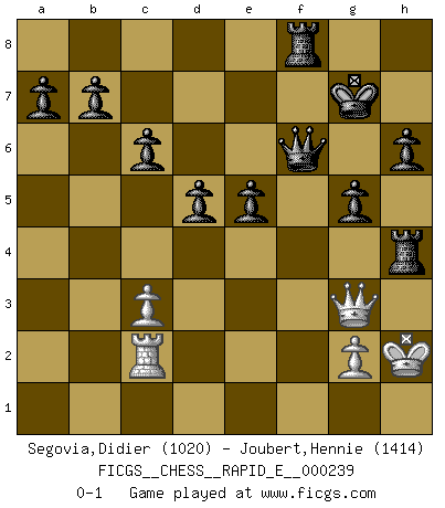 Last move : 0-1 2020 August 29 16:3:24 [Event "FICGS__CHESS__RAPID_E__000239"] [Site "FICGS"] [Date "2020.06.14"] [Round "1"] [White "Segovia,Didier"] [Black "Joubert,Hennie"] [Result "0-1"] [WhiteElo "1020"] [BlackElo "1414"] 1.e4 c6 2.d4 d5 3.e5 Bf5 4.Nf3 e6 5.Bd3 Bxd3 6.Qxd3 Ne7 7.O-O g6 8.Bg5 Bg7 9.Nc3 Nd7 10.b4 O-O 11.Ne2 h6 12.Bh4 g5 13.Bg3 Nf5 14.Nc3 Nb6 15.Nd2 Nxg3 16.Qxg3 Nd7 17.a4 f6 18.Nf3 fxe5 19.dxe5 Qc7 20.Rfe1 Rf4 21.Na2 Nxe5 22.Nc3 Nxf3+ 23.Kf1 Nxe1 24.Rxe1 e5 25.Ne2 Rxb4 26.c3 Rxa4 27.Nd4 Rc8 28.Ne6 Qe7 29.Nxg7 Kxg7 30.h4 Rxh4 31.Kg1 Re8 32.f4 Rxf4 33.Rc1 Qf6 34.Rc2 Rf8 35.Kh2 Rh4+ 0-1 Caro-Kann : Advance variation Kingside Castling by player White (move 7) Kingside Castling by player Black (move 10) Player Black won this chess game. Follow this game move after move (download)I played Chess with him and would have beaten him sometimes only he always took back his last move, and ran the game out differently. (Mark Twain) Schach verlangt totale Konzentration. (Robert James Fischer) No es suficiente ser un buen jugador, se debe también de jugar bién. (Siegbert Tarrasch) Ne tendez aucun piège pour le plaisir ! Ne jouez rien dans l'espoir que l'adversaire réagisse de façon stupide ! Prenez toujours pour acquis que l'adversaire va trouver le meilleur coup ! Ne jouez jamais de coup dans l'espoir que l'adversaire ne voie pas la menace ! Chacun de vos coups doit améliorer la position d'une façon ou d'une autre. If you are going through hell, keep going. (Winston Churchill)