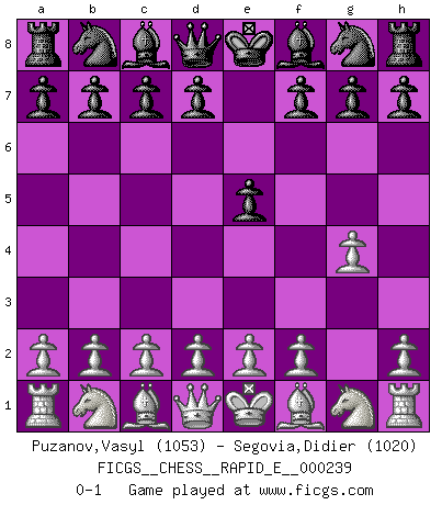 Last move : 0-1 2020 July 15 23:53:30 [Event "FICGS__CHESS__RAPID_E__000239"] [Site "FICGS"] [Date "2020.06.14"] [Round "1"] [White "Puzanov,Vasyl"] [Black "Segovia,Didier"] [Result "0-1"] [WhiteElo "1053"] [BlackElo "1020"] 1.g4 e5 0-1 This chess game has been lost on time (started : 2020.06.14 15:24:15) Grob's attack Player Black won this chess game. Follow this game move after move (download)At this time Fischer is simply a level above all the best Chessplayers in the world. (John Jacobs) Im Schach gibt es keinen Platz für Galanterie. (Irving Chernev) Cuando la partida de Ajedrez termina, el Peón y el Rey regresan a la misma caja. (Irish saying) L'ordinateur a tué l'originalité. Il n'y a plus guère d'aventures sur l'échiquier. (Jacob Murray) Philosophers use a language that is already deformed as though by shoes that are too tight. (Ludwig Wittgenstein)