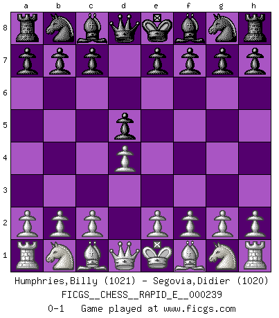 Last move : 0-1 2020 July 15 23:53:30 [Event "FICGS__CHESS__RAPID_E__000239"] [Site "FICGS"] [Date "2020.06.14"] [Round "1"] [White "Humphries,Billy"] [Black "Segovia,Didier"] [Result "0-1"] [WhiteElo "1021"] [BlackElo "1020"] 1.d4 d5 0-1 This chess game has been lost on time (started : 2020.06.14 15:24:15) Queen's pawn game Player Black won this chess game. Follow this game move after move (download)Some part of a mistake is always correct. (Savielly Tartakover) Der Traum, für den ich lebe, ist der von einem freien Russland. Viele mögen sagen: Russland hat doch ein Parlament, einen gewählten Präsidenten. Aber ich spüre, dass in meiner Heimat die Angst wiederkehrt. Eine Angst, sich frei zu äußern, bestimmte Dinge zu tun (Garry Kasparov) Yo jugué Ajedrez con el y a veces le pude haber ganado solo que siempre devuelve su última jugada y juega la partida de manera diferente. (Mark Twain) C'est la seule position que je connaisse où les deux camps sont mals. Propos prêtés à V. Anand. Always remember that you are unique; just like everyone else. (Unknown)