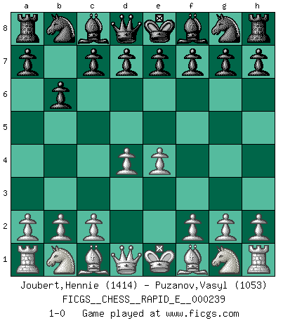 Last move : 1-0 2020 July 17 1:10:42 [Event "FICGS__CHESS__RAPID_E__000239"] [Site "FICGS"] [Date "2020.06.14"] [Round "1"] [White "Joubert,Hennie"] [Black "Puzanov,Vasyl"] [Result "1-0"] [WhiteElo "1414"] [BlackElo "1053"] 1.e4 b6 2.d4 1-0 This chess game has been lost on time (started : 2020.06.14 15:24:15) Owen defense Player White won this chess game. Follow this game move after move (download)Don't even mention losing to me. I can't stand to think of it. (Bobby Fischer) Wenn man heute mit 14 Jahren noch kein GM ist, kann man es vergessen. (Viswanathan Anand) Por esta medida (el intervalo entre Fischer y sus contemporaneos), yo le considero el mas grande campeón mundial. (Garry Kasparov) Les Echecs, c'est l'art de la guerre sans les charniers, c'est la résurrection des morts tombés au champ d'honneur, l'espoir perpétuel, la suprématie de l'intelligence sur la force, la culture de l'esprit. (F. Szpiner) Those who make the worst use of their time are the first to complain of its brevity. (Jean de la Bruyere)