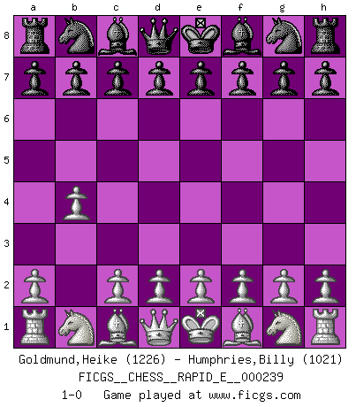 Last move : 1-0 2020 July 14 21:16:3 [Event "FICGS__CHESS__RAPID_E__000239"] [Site "FICGS"] [Date "2020.06.14"] [Round "1"] [White "Goldmund,Heike"] [Black "Humphries,Billy"] [Result "1-0"] [WhiteElo "1226"] [BlackElo "1021"] 1.b4 1-0 This chess game has been lost on time (started : 2020.06.14 15:24:15) Polish (Sokolsky) opening Player White won this chess game. Follow this game move after move (download)The stomach is an essential part of the Chess master. (Bent Larsen) Kein Großmeister ist normal. Sie unterscheiden sich nur im Ausmaß Ihrer Verrücktheit. (Viktor Kortschnoi) No volvere nunca a jugar contigo. Has insultado a mi amigo. - cuando un oponente se maldijo por una mala jugada (Miguel Najdorf) Demandez au pauvre Cg1 ce qu'il en pense. Eduard Gufeld à propos de la variante Saemisch de l'Est-Indienne. Wisdom doesn't necessarily come with age. Sometimes age just shows up all by itself. (Tom Watson)
