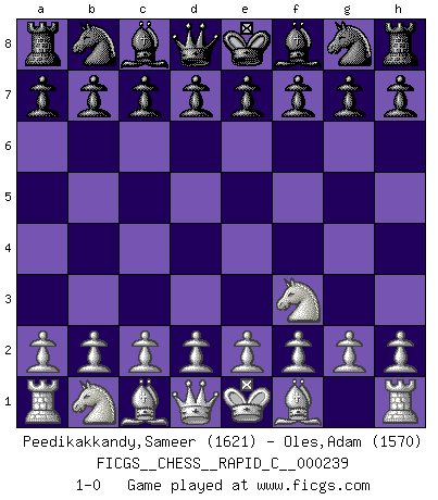 Last move : 1-0 2020 July 15 23:53:30 [Event "FICGS__CHESS__RAPID_C__000239"] [Site "FICGS"] [Date "2020.06.14"] [Round "1"] [White "Peedikakkandy,Sameer"] [Black "Oles,Adam"] [Result "1-0"] [WhiteElo "1621"] [BlackElo "1570"] 1.Nf3 1-0 This chess game has been lost on time (started : 2020.06.14 15:37:30) Reti Opening Player White won this chess game. Follow this game move after move (download)Nonsense was the last thing Fischer was interested in, as far as Chess was concerned. (Elie Agur) Schach ist wie eine schöne Frau, zu der wir ständig zurückkehren, gleichviel, wie oft sie uns zurückweist. (Anonymous) El arma más poderosa en el Ajedrez, es tener la próxima movida. (David Bronstein) Vouloir jouer aux échecs contre soi-même est aussi paradoxal que vouloir marcher sur son ombre. (Stefan Zweig) Just because you do not take an interest in politics doesn't mean politics won't take an interest in you. (Pericles 430 B.C.)