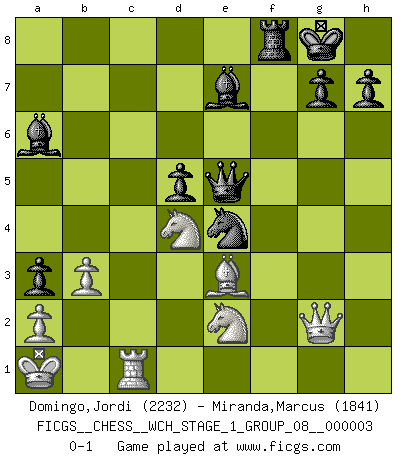 Last move : 0-1 2007 November 29 21:43:1 [Event "FICGS__CHESS__WCH_STAGE_1_GROUP_08__000003"] [Site "FICGS"] [Date "2007.07.11"] [Round "1"] [White "Domingo,Jordi"] [Black "Miranda,Marcus"] [Result "0-1"] [WhiteElo "2232"] [BlackElo "1841"] 1.e4 c5 2.Nf3 d6 3.d4 cxd4 4.Nxd4 Nf6 5.Nc3 a6 6.Be3 e6 7.Qd2 b5 8.f3 Nbd7 9.O-O-O Bb7 10.g4 Nb6 11.Qf2 Nfd7 12.Kb1 Rc8 13.Nce2 Qc7 14.Ng3 d5 15.e5 Nc4 16.f4 Bc5 17.Bc1 b4 18.h4 a5 19.Rh3 Qb6 20.Nge2 f6 21.f5 Ndxe5 22.Qg2 O-O 23.fxe6 Nd6 24.g5 Ne4 25.Be3 Nc4 26.Bg1 a4 27.Ka1 a3 28.b3 Ncd2 29.Rd3 Nxf1 30.Rf3 Qc7 31.gxf6 Rxf6 32.Rxf6 Nxf6 33.Qxf1 Ba6 34.Rc1 Rf8 35.Qg2 Ne4 36.h5 Qe5 37.c3 Qxh5 38.cxb4 Bxb4 39.Be3 Qe5 40.e7 Bxe7 0-1 Sicilian : Najdorf, Byrne (English) attack Queenside Castling by player White (move 9) Kingside Castling by player Black (move 22) Player Black won this chess game. Follow this game move after move (download)A man without frontiers. He didn't divide the East and the West, he brought them together in their admiration for him. (Ljubomir Ljubojevic, about Bobby Fischer's death) Ich bin es gewohnt, das die Jugend mir überhaupt keinen Respekt entgegenbringt. (Alexander Morozewich) Una compensación adecuada por un sacrificio es tener una combinación sólida que conduce a una posición ganadora; una compensación adecuada por una metida de pata es dejar a tu oponente arrebatar una derrota de las fauces de la victoria. (Bruce A. Moon) J'ai toujours senti une vague pitié pour l'homme qui ne connaît rien aux échecs, tout comme j'en aurais pour un homme ignorant de l'amour. Les Echecs, comme la musique ou comme l'amour, ont le pouvoir de rendre heureux. (Siegbert Tarrasch) Life is like a play: it's not the length but the excellence of the acting that matters. (Seneca)