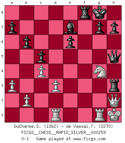 Last move : 0-1 2020 August 3 12:38:32 [Event "FICGS__CHESS__RAPID_SILVER__000259"] [Site "FICGS"] [Date "2020.06.14"] [Round "1"] [White "DuCharme,Steven"] [Black "de Vassal,Thibault"] [Result "0-1"] [WhiteElo "1362"] [BlackElo "2270"] 1.e4 c5 2.f4 d5 3.Bb5+ Bd7 4.Qe2 dxe4 5.Bxd7+ Qxd7 6.Qxe4 Nc6 7.Nf3 Nf6 8.Qe2 Rc8 9.c3 Qf5 10.O-O Qxf4 11.d3 Qg4 12.h3 Qh5 13.Bg5 e6 14.Nbd2 Be7 15.Bxf6 Bxf6 16.Ne4 Be7 17.Ng3 Qg6 18.Ne4 Rd8 19.Rad1 O-O 20.Qe3 Rd5 21.c4 Rh5 22.Kh1 Rd8 23.Nf2 b6 24.g4 Rh6 25.a3 f5 26.Rg1 Rf8 27.Ne5 Nxe5 28.Qxe5 fxg4 29.Nxg4 Rxh3+ 30.Qh2 Qh5 0-1 Sicilian : Grand Prix attack Kingside Castling by player White (move 10) Kingside Castling by player Black (move 19) Player Black won this chess game. Follow this game move after move (download)Could we look into the head of a Chess player, we should see there a whole world of feelings, images, ideas, emotion and passion. (Alfred Binet) Die größte Kunst beim Schach besteht darin dem Gegner nicht zu zeigen was er tun kann. (Garry Kasparov) Nada excita más a Grandes Maestros aburridos que una novedad teórica. (Dominic Lawson) Il vaut toujours mieux jouer un plan faux de façon logique que de n'avoir pas de plan du tout. (Victor Kortchnoï) If I had no sense of humor, I would long ago have committed suicide. (Mahatma Gandhi)