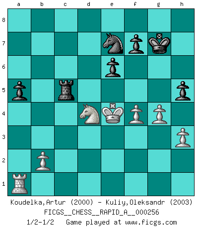 Last move : 1/2-1/2 2020 September 3 10:20:0 [Event "FICGS__CHESS__RAPID_A__000256"] [Site "FICGS"] [Date "2020.06.16"] [Round "1"] [White "Koudelka,Artur"] [Black "Kuliy,Oleksandr"] [Result "1/2-1/2"] [WhiteElo "2000"] [BlackElo "2003"] 1.d4 d5 2.c4 e6 3.Nc3 Nf6 4.Bg5 Be7 5.e3 Nbd7 6.Nf3 h6 7.Bh4 O-O 8.Rc1 c5 9.cxd5 Nxd5 10.Bxe7 Nxe7 11.Bb5 cxd4 12.Qxd4 Nf6 13.O-O b6 14.Rfd1 Bb7 15.Qe5 Qb8 16.Qxb8 Raxb8 17.Ne5 Rfc8 18.f3 Rc5 19.Nd3 R5c8 20.Kf2 a6 21.Ba4 b5 22.Bb3 g5 23.Ne2 Nd7 24.a4 bxa4 25.Bxa4 Bc6 26.Bxc6 Nxc6 27.h3 Nde5 28.Nxe5 Nxe5 29.Rxc8+ Rxc8 30.Nd4 Rc5 31.f4 gxf4 32.exf4 Ng6 33.Ke3 Kg7 34.g4 Ne7 35.Ra1 a5 36.Ke4 h5 1/2-1/2 QGD : 4.Bg5 Be7 Kingside Castling by player Black (move 7) Kingside Castling by player White (move 13) This chess game ended in a draw. Follow this game move after move (download)I prefer to lose a really good game than to win a bad one. (David Levy) Taktik ist was man tun muß, wenn etwas zu tun ist. Strategie ist was man tun muß, wenn nichts zu tun ist. (Savielly Grigorievitsch Tartakower) Del Ajedrez se ha dicho que la vida no es lo suficientemente larga para él, pero eso es culpa de la vida, no del Ajedrez. (William Ewart Napier) RxDa4 pat (...) Every vice is only an exaggeration of a necessary and virtuous function. (Ralph Waldo Emerson, Journals 1936)