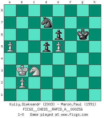 Last move : 1-0 2020 August 10 18:16:58 [Event "FICGS__CHESS__RAPID_A__000256"] [Site "FICGS"] [Date "2020.06.16"] [Round "1"] [White "Kuliy,Oleksandr"] [Black "Maron,Paul"] [Result "1-0"] [WhiteElo "2003"] [BlackElo "1991"] 1.d4 d5 2.c4 c6 3.cxd5 cxd5 4.Bf4 Nc6 5.e3 Nf6 6.Nc3 a6 7.Be2 Bf5 8.g4 Be4 9.f3 Bg6 10.h4 h6 11.Rc1 e6 12.Nh3 Be7 13.Bg3 Bh7 14.Nf4 Nd7 15.Kf2 Rc8 16.Bd3 Bxd3 17.Nxd3 O-O 18.g5 hxg5 19.hxg5 Bxg5 20.f4 Bh6 21.Bh4 f6 22.Qg4 Qe7 23.Rcg1 Rfe8 24.Qh5 Kf8 25.Ne5 Ndxe5 26.dxe5 Qf7 27.Rg6 fxe5 28.Rhg1 Re7 29.Rxh6 gxh6 30.Qxh6+ Ke8 31.Bxe7 Nxe7 32.Rg7 Qf8 33.Qh5+ Kd7 34.Qxe5 Qh8 35.Qf6 Qh2+ 36.Ke1 Re8 37.Ne2 Qh1+ 38.Kd2 Qb1 39.a4 a5 40.Qc3 Rg8 41.Rxg8 Nxg8 42.Qb3 Nf6 43.Nc3 Qg1 44.Qxb7+ Ke8 45.Qa8+ Kf7 46.Qxa5 Qf2+ 47.Kd3 Qf1+ 48.Kc2 Qf2+ 49.Kb3 Qxe3 50.Qc7+ Kg6 51.Qe5 Qxe5 52.fxe5 Nd7 53.a5 1-0 QGD Slav defense : Exchange variation Kingside Castling by player Black (move 17) 10 pieces endgame at move 51 : White KNPPP , Black KQNPP WHITE : King + 1 Knight 3 Pawns BLACK : King + 1 Queen 1 Knight 2 Pawns 9 pieces endgame at move 52 : White KNPPP , Black KNPP WHITE : King + 1 Knight 3 Pawns BLACK : King + 1 Knight 2 Pawns Player White won this chess game. Follow this game move after move (download)If your opponent cannot do anything active, then don't rush the position; instead you should let him sit there, suffer, and beg you for a draw. (Jeremy Silman) Ich bin der einzige Schachspieler, der sich während der Vorbereitungen zum Turnier verletzt hat. (Woody Allen) El Ajedrez es 99 por ciento táctica. (Teichmann) Karpov est une pièce de musée. (Garry Kasparov) You can't play chess if you're groggy from pills. (Anatoly Karpov)