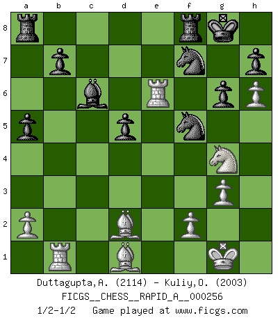 Last move : 1/2-1/2 2020 August 14 19:51:48 [Event "FICGS__CHESS__RAPID_A__000256"] [Site "FICGS"] [Date "2020.06.16"] [Round "1"] [White "Duttagupta,Aniruddha"] [Black "Kuliy,Oleksandr"] [Result "1/2-1/2"] [WhiteElo "2114"] [BlackElo "2003"] 1.e4 e6 2.d4 d5 3.e5 c5 4.c3 Bd7 5.Nf3 Nc6 6.Be2 Nge7 7.Na3 cxd4 8.cxd4 Ng6 9.h4 Be7 10.g3 O-O 11.h5 Nh8 12.h6 g6 13.Nc2 f6 14.exf6 Bxf6 15.Ne3 Qb6 16.Ng4 Bxd4 17.Nxd4 Nxd4 18.Be3 Qb4+ 19.Bd2 Qxb2 20.Rb1 Qc2 21.O-O Qxd1 22.Bxd1 Bc6 23.Rb4 Nf5 24.Re1 a5 25.Rb1 Nf7 26.Rxe6 1/2-1/2 French : Advance variation Kingside Castling by player Black (move 10) Kingside Castling by player White (move 21) This chess game ended in a draw. Follow this game move after move (download)I'm not afraid of Spassky. The world knows I'm the best. You don't need a match to prove it. (Bobby Fischer) Ich weiss nicht was Gott gegen mich auf 1.e4 antworten würde. (Robert James Fischer) Puntos débiles o agujeros en la posición de tu oponente deben de ser ocupados por piezas, no Peones. (Siegbert Tarrasch) La vie et les Echecs sont tous les deux une lutte constante. (Lasker) Perseverance does not equal worthiness. Next time you want to get my attention, wear something fun. Low-riding jeans are hot. (Gregory House, House M.D.)