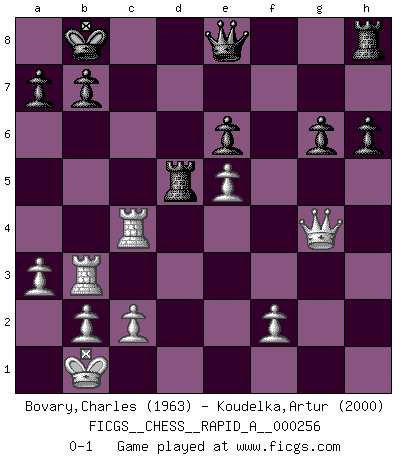 Last move : 0-1 2020 October 11 9:42:37 [Event "FICGS__CHESS__RAPID_A__000256"] [Site "FICGS"] [Date "2020.06.16"] [Round "1"] [White "Bovary,Charles"] [Black "Koudelka,Artur"] [Result "0-1"] [WhiteElo "1963"] [BlackElo "2000"] 1.e4 c6 2.d4 d5 3.Nc3 dxe4 4.Nxe4 Bf5 5.Ng3 Bg6 6.h4 h6 7.h5 Bh7 8.Nf3 Nd7 9.Bd3 Bxd3 10.Qxd3 e6 11.Bf4 Qa5+ 12.Bd2 Qc7 13.O-O-O Ngf6 14.Ne4 O-O-O 15.g3 Nxe4 16.Qxe4 Nf6 17.Qe2 Bd6 18.Ne5 c5 19.Kb1 cxd4 20.Bf4 Nd5 21.Rxd4 Kb8 22.Rc4 Nxf4 23.gxf4 Qe7 24.a3 Bc7 25.Rh3 Rd5 26.Rb3 Bxe5 27.fxe5 g6 28.hxg6 fxg6 29.Qg4 Qe8 0-1 This chess game has been lost on time (started : 2020.06.16 21:15:6) Caro-Kann : Classical, 6.h4 Queenside Castling by player White (move 13) Queenside Castling by player Black (move 14) Player Black won this chess game. Follow this game move after move (download)Alekhine is a poet who creates a work of art out of something that would hardly inspire another man to send home a picture post card. (Max Euwe) Es ist peinlich, dass ich nie Weltmeister wurde. Es wäre leicht, Leonid Breschnjew als Ursache vorzuschieben, dessen Apparat den Vorzeigekommunisten Anatoli Karpow in allem unterstützte. Aber Garri Kasparow zum Beispiel, der ebenfalls von den Sowjets unerwünscht war, hat trotz der Widerstände den WM-Titel erobert. (Viktor Kortschnoi) El Ajedrez es de 30 a 40 por ciento psicología. Uno no cuenta con esto cuando se juega contra una computadora. No lo puedo confundir. (Judith Polgar) Les Echecs représentent une sphère d'idées créatrices basée sur la volonté des deux protagonistes. (Smyslov) Hold em is to stud what chess is to checkers. (Johnny Moss)