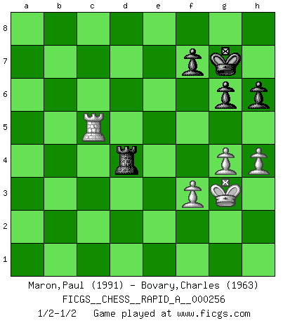 Last move : 1/2-1/2 2020 August 7 19:14:3 [Event "FICGS__CHESS__RAPID_A__000256"] [Site "FICGS"] [Date "2020.06.16"] [Round "1"] [White "Maron,Paul"] [Black "Bovary,Charles"] [Result "1/2-1/2"] [WhiteElo "1991"] [BlackElo "1963"] 1.d4 Nf6 2.Nf3 g6 3.e3 Bg7 4.Be2 O-O 5.c4 c5 6.d5 d6 7.Nc3 e6 8.e4 exd5 9.exd5 Bf5 10.O-O Ne4 11.Nxe4 Bxe4 12.Ng5 Bf5 13.Bd3 Bxd3 14.Qxd3 Nd7 15.Qb3 Re8 16.Bd2 h6 17.Nf3 Rb8 18.Rfc1 Ne5 19.Rab1 b5 20.cxb5 a6 21.Nxe5 Rxe5 22.Bc3 Rxb5 23.Qa4 Rxd5 24.Qxa6 Rb6 25.Qc4 Qg5 26.Rd1 Rf5 27.Bxg7 Kxg7 28.b3 Rb4 29.Qc3+ Qf6 30.Qxf6+ Rxf6 31.f3 Re6 32.Kf2 Rb6 33.Rd5 Re8 34.Rbd1 Ra8 35.R1d2 Rba6 36.Rxd6 Rxd6 37.Rxd6 Rxa2+ 38.Kg3 Rc2 39.Rc6 Rc3 40.Rb6 c4 41.bxc4 Rxc4 42.Kh3 Ra4 43.g4 Rc4 44.Kg3 Ra4 45.Rb5 Rc4 46.h4 Ra4 47.Rc5 Rd4 1/2-1/2 King's Indian : East Indian defense Kingside Castling by player Black (move 4) Kingside Castling by player White (move 10) 10 pieces endgame at move 41 : White KRPPP , Black KRPPP WHITE : King + 1 Rook 3 Pawns BLACK : King + 1 Rook 3 Pawns This chess game ended in a draw. Follow this game move after move (download)Only the player with the initiative has the right to attack. (Wilhelm Steinitz) Schach verlangt totale Konzentration. (Robert James Fischer) Tu sabes, camarada Pachman, no disfruto el ser un Ministro, preferería jugar al Ajedrez como tu. (Che Guevara) Lorsque vous vous retrouvez devant une position atroce, ne tendez pas un ultime piège dérisoire avec l'intention d'abandonner si l'adversaire le déjoue ! Faites-vous plutôt un devoir de résister comme si votre vie en dépendait. Jouez le coup qui vous déplairait au centuple si vous étiez dans la peau de votre tortionnaire ! Now be brave and don't look back. Don't look back. (Shmi Skywalker in Star Wars ep.1)