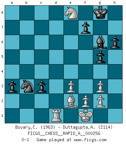 Last move : 0-1 2020 September 26 10:49:52 [Event "FICGS__CHESS__RAPID_A__000256"] [Site "FICGS"] [Date "2020.06.16"] [Round "1"] [White "Bovary,Charles"] [Black "Duttagupta,Aniruddha"] [Result "0-1"] [WhiteElo "1963"] [BlackElo "2114"] 1.d4 d5 2.c4 e6 3.Nc3 Nf6 4.Nf3 Bb4 5.cxd5 exd5 6.Bg5 h6 7.Bh4 O-O 8.e3 Bf5 9.Qb3 Bxc3+ 10.bxc3 Nbd7 11.Be2 c5 12.dxc5 Nxc5 13.Qb4 Rc8 14.O-O Re8 15.Rfd1 g5 16.Bg3 a5 17.Qa3 Nce4 18.c4 Qb6 19.Nd4 Bg6 20.Rdb1 Qc5 21.Qxc5 Rxc5 22.Rxb7 Nxg3 23.hxg3 dxc4 24.Rc1 c3 25.Rb5 Rc7 26.Kf1 a4 27.Rb6 Nd5 28.Rd6 Nb4 29.Nb5 Nxa2 30.Nxc7 Nxc1 31.Nxe8 a3 32.Rd1 Nb3 0-1 This chess game has been lost on time (started : 2020.06.16 21:15:6) QGD : Ragozin variation Kingside Castling by player Black (move 7) Kingside Castling by player White (move 14) Player Black won this chess game. Follow this game move after move (download)The game of Chess is not merely an idle amusement; several very valuable qualities of the mind are to be acquired and strengthened by it, so as to become habits ready on all occasions; for life is a kind of Chess. (Benjamin Franklin) Herr Iljumschinow ist ein etwas merkwürdiger Geschäftsmann: Er arbeitet zusammen mit Leuten wie Muammar al-Gaddafi; früher ist das Saddam Hussein gewesen. (Joel Lautier) Uno no tiene que jugar muy bien, es suficiente jugar mejor que el oponente. (Siegbert Tarrasch) Un footballeur joue avec ses pieds, parfois avec sa tête. Un joueur d'échecs ne joue qu'avec sa tête. Et quand il ne joue plus, il meurt. (Jacob Murray) Over-the-board chess is the favorite of mortals, correspondence chess is the favorite of the gods. (Eduard Dyckhoff)