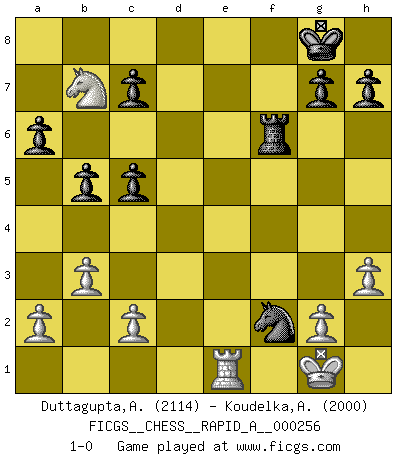 Last move : 1-0 2020 September 12 4:18:46 [Event "FICGS__CHESS__RAPID_A__000256"] [Site "FICGS"] [Date "2020.06.16"] [Round "1"] [White "Duttagupta,Aniruddha"] [Black "Koudelka,Artur"] [Result "1-0"] [WhiteElo "2114"] [BlackElo "2000"] 1.e4 e5 2.Nf3 Nc6 3.Bb5 a6 4.Bxc6 dxc6 5.O-O f6 6.d4 Bg4 7.dxe5 Qxd1 8.Rxd1 fxe5 9.Rd3 Bd6 10.Nbd2 Nf6 11.Nc4 O-O 12.Nfxe5 Be2 13.Re3 Bxc4 14.Nxc4 Bc5 15.Re1 Rae8 16.Be3 Bxe3 17.Rxe3 Rxe4 18.Rxe4 Nxe4 19.Re1 Nxf2 20.h3 b5 21.Na5 Rf6 22.b3 c5 23.Nb7 1-0 This chess game has been lost on time (started : 2020.06.16 21:15:6) Ruy Lopez : Exchange, Gligoric variation Kingside Castling by player White (move 5) Kingside Castling by player Black (move 11) Player White won this chess game. Follow this game move after move (download)When I have White, I win because I am white; When I have Black, I win because I am Bogolyubov. (Bogolyubov) Der Traum, für den ich lebe, ist der von einem freien Russland. Viele mögen sagen: Russland hat doch ein Parlament, einen gewählten Präsidenten. Aber ich spüre, dass in meiner Heimat die Angst wiederkehrt. Eine Angst, sich frei zu äußern, bestimmte Dinge zu tun (Garry Kasparov) En el Ajedrez, tal como en la vida, las bendiciones de hoy pueden ser el veneno del mañana. (Assaic) 'L'échange des dames est un coup dur pour les deux adversaires...' Un journaliste lors d'une partie du match Spassky-Fischer Experiences are the keys to life. (Daniel Parmet)