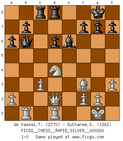 Last move : 1-0 2020 July 27 3:5:35 [Event "FICGS__CHESS__RAPID_SILVER__000260"] [Site "FICGS"] [Date "2020.06.17"] [Round "2"] [White "de Vassal,Thibault"] [Black "DuCharme,Steven"] [Result "1-0"] [WhiteElo "2270"] [BlackElo "1362"] 1.e4 Nf6 2.e5 Nd5 3.d4 d6 4.Nf3 e6 5.c4 Nb6 6.exd6 cxd6 7.Nc3 Be7 8.Be2 O-O 9.O-O Nc6 10.Be3 Bf6 11.Rc1 Bd7 12.h3 a6 13.d5 exd5 14.cxd5 Nb4 15.Qb3 Bxc3 16.Bxb6 Qxb6 17.bxc3 Nxd5 18.Qxd5 Be6 19.Qd2 Rac8 20.Rfd1 Rfd8 21.Nd4 Bd7 22.Bf3 Be6 23.Rb1 1-0 Alekhine's defense : Modern variation Kingside Castling by player Black (move 8) Kingside Castling by player White (move 9) Player White won this chess game. Follow this game move after move (download)Bobby just drops the pieces and they fall on the right squares. (Miguel Najdorf) Ich bewundere Kasparows phantasievolle Angriffssiege aus den Achtzigern und Neunzigern, aber wenn man sie mit dem Computer überprüft, nimmt der Computer in jeder zweiten Partie die Opfer an, verteidigt sich und gewinnt. (Vladimir Kramnik) De todos mis libros Rusos, la defensa contiene y difunde el 'calor' mas grande que pudiese verse extraño al observar lo supremamente abstracto que el Ajedrez supuestamente es. (Vladimir Nabokov) Ce n'est pas pour s'amuser qu'il joue aux échecs : il célèbre un culte. (Vladimir Nabokov) I believe in luck. How else can you explain the success of those you dislike ? (Jean Cocteau)