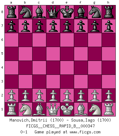 Last move : 0-1 2020 July 19 8:18:25 [Event "FICGS__CHESS__RAPID_B__000347"] [Site "FICGS"] [Date "2020.06.19"] [Round "1"] [White "Manovich,Dmitrii"] [Black "Sousa,Iago"] [Result "0-1"] [WhiteElo "1700"] [BlackElo "1700"] 0-1 This chess game has been lost on time (started : 2020.06.19 0:43:29) Player Black won this chess game. Follow this game move after move (download)Every Chess master was once a beginner. (Chernev) Sie bekommen vielleicht den Eindruck, dass die Spitzenspieler überhaupt gar nicht so stark sind. Aber das stimmt nicht. Es ist eine Illusion. Mit einem Computer an der Seite ist es sehr leicht, Urteile zu fällen, aber wenn man alleine am Brett sitzt, sieht die Sache ganz anders aus. (Vladimir Kramnik) Solo existe una cosa que Fischer hace en el Ajedrez sin placer: ¡perder!. (Boris Spassky) On peut tirer plus d'utilité d'une partie perdue que de 100 parties gagnées. (Capablanca) Creativity involves breaking out of established patterns in order to look at things in a different way. (Edward De Bono)