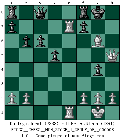 Last move : 1-0 2007 August 21 8:53:59 [Event "FICGS__CHESS__WCH_STAGE_1_GROUP_08__000003"] [Site "FICGS"] [Date "2007.07.11"] [Round "1"] [White "Domingo,Jordi"] [Black "O Brien,Glenn"] [Result "1-0"] [WhiteElo "2232"] [BlackElo "1391"] 1.e4 e5 2.Nf3 Nc6 3.Bc4 Bc5 4.c3 Nf6 5.d4 exd4 6.cxd4 Bb4+ 7.Nc3 Nxe4 8.O-O Bxc3 9.d5 Bf6 10.Re1 Ne7 11.Rxe4 d6 12.Bg5 Bxg5 13.Nxg5 h6 14.Qe2 hxg5 15.Re1 Be6 16.Re3 Nxd5 17.Bxd5 O-O 18.Rxe6 c6 19.Bb3 d5 20.Re7 Qc8 21.Bc2 g4 22.Qe5 b6 23.Qh5 g6 24.Bxg6 1-0 Giuoco Piano : Greco's attack Kingside Castling by player White (move 8) Kingside Castling by player Black (move 17) Player White won this chess game. Follow this game move after move (download)He who takes the Queen's Knight's Pawn will sleep in the streets. (Anonymous) Schach ist ein Kampf gegen den Fehler. (Johannes Herrman Zukertort) Un juego de Ajedrez es un dialogo, una conversación entre un jugador y su oponente. Cada movimiento del oponente puede contener amenazas o tropiezos, pero un jugador no se puede defender de las amenazas o tomar ventaja de los tropiezos si es que no se pregunta a sí mismo: ¿Que es lo que mi oponente va a hacer después de cada movida?. (Bruce A. Moon) Il n'y a plus de joueurs du niveau de Jacob Murray dont la seule quête est le beau jeu, le plaisir de voir les pièces construire quelque chose. Sur 10 idées à la minute, 9 seront sans intérêt, la dernière s'avèrera géniale. (Christian Bauer) It is not titles that honor men, but men that honor titles. (Niccolo Machiavelli)
