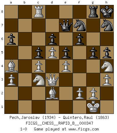 Last move : 1-0 2020 October 9 0:11:1 [Event "FICGS__CHESS__RAPID_B__000347"] [Site "FICGS"] [Date "2020.06.19"] [Round "1"] [White "Pech,Jaroslav"] [Black "Quintero,Raul"] [Result "1-0"] [WhiteElo "1934"] [BlackElo "1863"] 1.d4 Nf6 2.c4 d6 3.Nc3 g6 4.e4 Bg7 5.Nf3 O-O 6.Be2 c6 7.O-O Qc7 8.Be3 e5 9.d5 c5 10.Ne1 a6 11.h3 Nbd7 12.Qc2 b6 13.Rc1 Bb7 14.Qd2 Rfe8 15.a3 Rab8 16.Bg5 h5 17.Be3 Kh7 18.Nf3 Kh8 19.Bd3 Rf8 20.Rfe1 Nh7 21.Rb1 Rbe8 22.Bc2 Bc8 23.Qe2 Rg8 24.b4 Ref8 25.Ba4 f6 26.Nh4 Bh6 27.Bxh6 Rf7 28.Qd3 Qd8 29.Qg3 Ng5 30.Qe3 Nf8 31.Rb2 Nfh7 32.bxc5 bxc5 33.Rb8 Rb7 34.Rxb7 Bxb7 35.Qd3 Nf7 36.Bd2 Qe7 37.Rb1 Bc8 38.Rb8 g5 39.Rxc8 1-0 Old Indian defense Kingside Castling by player Black (move 5) Kingside Castling by player White (move 7) Player White won this chess game. Follow this game move after move (download)We don't really know how the game was invented, though there are suspicions. As soon as we discover the culprits, we'll let you know. (Bruce Pandolfini) Die jungen Leute sollen verstehen, dass sie noch etwas von mir lernen können und müssen. (Viktor Kortschnoi) ¿Esta Bobby Fischer algo cuerdo?. (Salo Flohr) Il vaut toujours mieux jouer un plan faux de façon logique que de n'avoir pas de plan du tout. (Victor Kortchnoï) Experience is the name we all give to our mistakes. (Oscar Wilde)