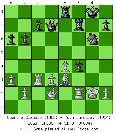 Last move : 0-1 2020 August 16 1:11:6 [Event "FICGS__CHESS__RAPID_B__000347"] [Site "FICGS"] [Date "2020.06.19"] [Round "1"] [White "Cabrera,Claudio"] [Black "Pech,Jaroslav"] [Result "0-1"] [WhiteElo "1882"] [BlackElo "1934"] 1.c4 e5 2.Nc3 Nf6 3.Nf3 Nc6 4.g3 d5 5.cxd5 Nxd5 6.Bg2 Nb6 7.d3 Be7 8.O-O O-O 9.Be3 Be6 10.Rc1 f6 11.Nd2 Qd7 12.Nb3 Bh3 13.Nc5 Bxc5 14.Bxc5 Bxg2 15.Kxg2 Rf7 16.f4 exf4 17.Rxf4 Nd5 18.Ra4 Nxc3 19.Rxc3 Re8 20.Qc2 a6 21.a3 f5 22.Rf4 g5 23.Rf2 Ne5 24.Qd2 f4 25.gxf4 Ng6 26.e4 b6 27.Be3 gxf4 0-1 English Opening Kingside Castling by player White (move 8) Kingside Castling by player Black (move 8) Player Black won this chess game. Follow this game move after move (download)Fischer is the strongest player in the world. In fact, the strongest player who ever lived. (Larry Evans) Wie bekannt hörte Morphy 1859 auf, Schach zu spielen. Seine Enttäuschung galt nicht so sehr dem Schach, wie den Schachspielern. (Robert James Fischer) ¿Porque tengo que perder ante este idiota?. (Aron Nimzovich) Les échecs sont plus proches de l'art de l'assassinat que de l'art de la guerre. (Arturo Perez-Reverte) If you lose the game you should win the analysis! (Proverb)