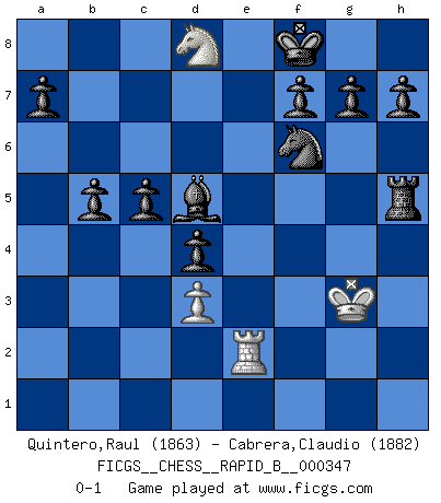 Last move : 0-1 2020 July 12 7:19:4 [Event "FICGS__CHESS__RAPID_B__000347"] [Site "FICGS"] [Date "2020.06.19"] [Round "1"] [White "Quintero,Raul"] [Black "Cabrera,Claudio"] [Result "0-1"] [WhiteElo "1863"] [BlackElo "1882"] 1.e4 e6 2.d4 d5 3.exd5 exd5 4.Bf4 Bd6 5.Qf3 Nf6 6.Bd3 O-O 7.Bxd6 Qxd6 8.h3 Qb4+ 9.Nd2 Qxb2 10.Rb1 Qxd4 11.Ne2 Qh4 12.O-O Nbd7 13.Qe3 Re8 14.Qf3 Ne5 15.Qg3 Qxg3 16.fxg3 Nxd3 17.cxd3 Rxe2 18.Nf3 b6 19.Nd4 Rxa2 20.g4 c5 21.Nc6 Ba6 22.Rf3 Re8 23.g5 Nd7 24.h4 R8e2 25.Rg3 d4 26.h5 Bb7 27.Nd8 Bd5 28.Rf1 Rxg2+ 29.Rxg2 Rxg2+ 30.Kh1 Rxg5 31.Kh2 Rxh5+ 32.Kg3 Nf6 33.Re1 Kf8 34.Re2 b5 0-1 French : Exchange variation Kingside Castling by player Black (move 6) Kingside Castling by player White (move 12) Player Black won this chess game. Follow this game move after move (download)I feel as if I were a piece in a game of Chess, when my opponent says of it: That piece cannot be moved. (Soren Kierkegaard) Fischer ist das größte Genie, das je vom Schachhimmel heruntergestiegen ist. (Mikhail Nekhemyevich Tal) Coloca el contenido del tablero de Ajedrez en un sombrero, agita las piezas vigorosamente, derrámalas en el tablero desde una altura de medio metro y así obtienes el estilo de Wilhelm Steinitz. (H. E. Bird) Je crois qu'il existe des manières très spécifiques de jouer efficacement contre une machine. Evidemment, nous n'avons aucune chance en technique pure, parce que l'ordinateur calcule de manière parfaite. Mais lorsque nous faisons appel à notre cerveau, en utilisant l'intuition et la compréhension, alors nous restons beaucoup plus forts. (Anatoli Karpov) 98% of all statistics are made up. (Author unknown)