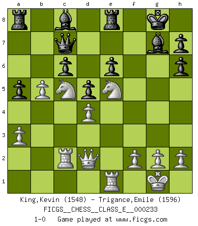 Last move : 1-0 2020 September 3 10:42:11 [Event "FICGS__CHESS__CLASS_E__000233"] [Site "FICGS"] [Date "2020.06.19"] [Round "1"] [White "King,Kevin"] [Black "Trigance,Emile"] [Result "1-0"] [WhiteElo "1548"] [BlackElo "1596"] 1.e4 e6 2.d4 d5 3.e5 c5 4.c3 Nc6 5.Nf3 Qb6 6.a3 Nh6 7.b4 cxd4 8.Bxh6 gxh6 9.cxd4 Bd7 10.Ra2 Bg7 11.Nc3 f6 12.exf6 Bxf6 13.Na4 Qd8 14.Nc5 Qc7 15.Qd2 Bg7 16.Bb5 a6 17.Bxc6 bxc6 18.O-O O-O 19.Re1 Rfe8 20.Ne5 Bc8 21.Rc2 a5 22.b5 1-0 French : Advance, Paulsen attack Kingside Castling by player White (move 18) Kingside Castling by player Black (move 18) Player White won this chess game. Follow this game move after move (download)Those who say they understand Chess, understand nothing. (Robert Hubner) Ich habe Kasparov in Rente geschickt. (Veselin Topalov) El Ajedrez por encima de todo... ¡es una pelea!. (Emanuel Lasker) On est toujours la mazette de quelqu'un d'autre. (Anonyme) Have no fear of perfection - you'll never reach it. (Salvador Dali)