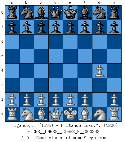 Last move : 1-0 2020 August 9 20:13:1 [Event "FICGS__CHESS__CLASS_E__000233"] [Site "FICGS"] [Date "2020.06.19"] [Round "1"] [White "Trigance,Emile"] [Black "Fritando Loko,Mihauzinho"] [Result "1-0"] [WhiteElo "1596"] [BlackElo "1200"] 1.g4 1-0 This chess game has been lost on time (started : 2020.06.19 22:16:45) Grob's attack Player White won this chess game. Follow this game move after move (download)Adequate compensation for a sacrifice is having a sound combination leading to a winning position; adequate compensation for a blunder is having your opponent snatch defeat from the jaws of victory. (Bruce A. Moon) Irgendwie scheint mir sonntags früh um 9 Uhr der Killerinstinkt verloren gegangen zu sein. (Alexej Shirov) Un Peón pasado aumenta su poder a medida de que el número de piezas en el tablero disminuye. (Capablanca) Dieu déplace le joueur, et celui-ci la pièce. Quel Dieu derrière Dieu commence donc la trame ? Arturo Perez-Reverte (prix de littérature policière 1993). The quality of decision is like the well-timed swoop of a falcon which enables it to strike and destroy its victim. (Sun Tzu)