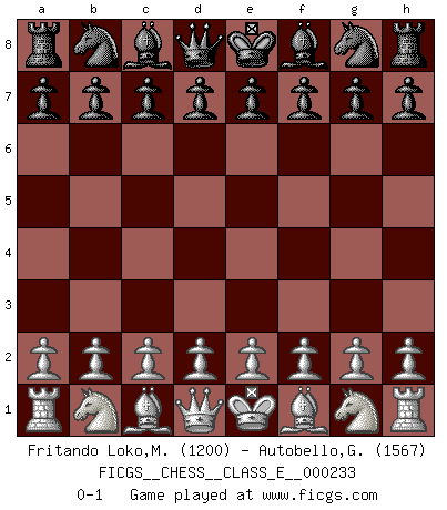 Last move : 0-1 2020 July 30 9:58:29 [Event "FICGS__CHESS__CLASS_E__000233"] [Site "FICGS"] [Date "2020.06.19"] [Round "1"] [White "Fritando Loko,Mihauzinho"] [Black "Autobello,Giovanni"] [Result "0-1"] [WhiteElo "1200"] [BlackElo "1567"] 0-1 This chess game has been lost on time (started : 2020.06.19 22:16:45) Player Black won this chess game. Follow this game move after move (download)With or without the title, Bobby Fischer was unquestionably the greatest player of his time. (Burt Hochberg) Im Schach gewinnt jeder. Hat man Freunde am Spiel - und das ist die Hauptsache - ist auch der Verlust einer Partie kein Unglück. (David Bronstein) Una partida de Ajedrez se divide en 3 etapas: la primera cuando piensas que tienes la ventaja, la segunda cuando crees que tienes la ventaja y la tercera... ¡cuando te das cuenta que vas a perder!. (Savielly Tartakower) Karpov est une pièce de musée. (Garry Kasparov) You cannot beat a roulette table unless you steal money from it. (Albert Einstein)