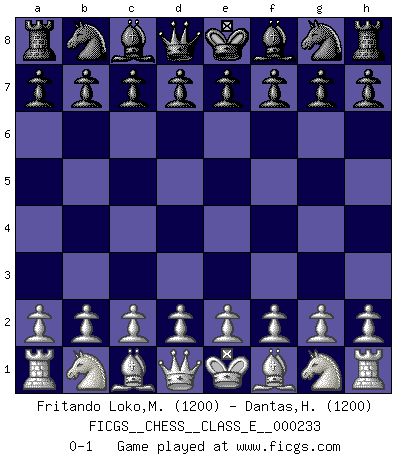 Last move : 0-1 2020 July 30 9:58:29 [Event "FICGS__CHESS__CLASS_E__000233"] [Site "FICGS"] [Date "2020.06.19"] [Round "1"] [White "Fritando Loko,Mihauzinho"] [Black "Dantas,Hiago"] [Result "0-1"] [WhiteElo "1200"] [BlackElo "1200"] 0-1 This chess game has been lost on time (started : 2020.06.19 22:16:45) Player Black won this chess game. Follow this game move after move (download)Fischer, who may or may not be mad as a hatter, has every right to be horrified. (Jeremy Silman) Ich war schon mal beim Dopingtest. Da musste ich Urin abgeben, während Dritte zusahen. (Elisabeth Pähtz) Con o sin el título, Bobby Fischer fue sin lugar a dudas el mas grande jugador de su época. (Burt Hochberg) A chaque perte on perd un peu de soi. (Joël Lautier) A computer lets you make more mistakes faster than any invention in human history - with the possible exceptions of handguns and tequila. (Mitch Ratcliffe)