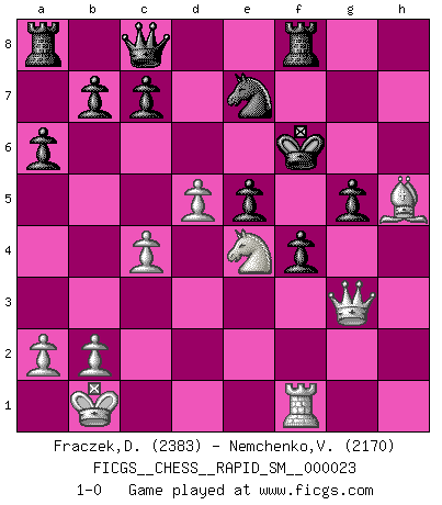 Last move : 1-0 2020 September 2 8:41:21 [Event "FICGS__CHESS__RAPID_SM__000023"] [Site "FICGS"] [Date "2020.06.21"] [Round "1"] [White "Fraczek,Dariusz"] [Black "Nemchenko,Valery"] [Result "1-0"] [WhiteElo "2383"] [BlackElo "2170"] 1.d4 Nf6 2.c4 g6 3.g3 Bg7 4.Bg2 O-O 5.Nc3 d6 6.Nf3 Bg4 7.h3 Bxf3 8.Bxf3 Nc6 9.e3 Nd7 10.Bg2 e5 11.d5 Ne7 12.e4 f5 13.h4 Nf6 14.Bg5 Qe8 15.Qd3 h6 16.Bxf6 Bxf6 17.O-O-O a6 18.h5 gxh5 19.Bf3 Bg5+ 20.Kb1 Kg7 21.Bxh5 Qc8 22.f4 exf4 23.gxf4 Bxf4 24.Rdg1+ Bg5 25.Rxg5+ hxg5 26.Qg3 Kf6 27.Rf1 f4 28.e5+ dxe5 29.Ne4+ 1-0 King's Indian : 3.g3 Kingside Castling by player Black (move 4) Queenside Castling by player White (move 17) Player White won this chess game. Follow this game move after move (download)There must have been a time when men were demigods, or they could not have invented Chess. (Gustav Schenk) Kann Schach nicht schließlich das Nationalspiel der Deutschen werden? Und welche weiteren Ausblicke bieten sich dann dar! Welche Hebung des allgemeinen Kultur-Niveaus, ja der Moral, wenn das Schachbrett den Kartentisch verdrängen würde! Wahrlich, ein Ziel, des Schweißes der Edlen wert! (Siegbert Tarrasch) No es una movida, aún la mejor movida que tu debas buscar, sino un plan comprensible. (Eugene Znosko-Borovsky) Le moment que je préfère le plus dans une rencontre, c'est celui où je sens que la personnalité de l'adversaire se brise. (Robert Fischer) Whoever said the pen is mightier than the sword obviously never encountered automatic weapons. (US General Douglas MacArthur)