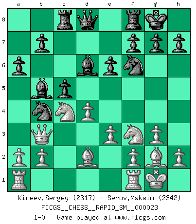Last move : 1-0 2020 August 4 19:5:29 [Event "FICGS__CHESS__RAPID_SM__000023"] [Site "FICGS"] [Date "2020.06.21"] [Round "1"] [White "Kireev,Sergey"] [Black "Serov,Maksim"] [Result "1-0"] [WhiteElo "2317"] [BlackElo "2342"] 1.d4 Nf6 2.c4 e6 3.Nf3 d5 4.g3 dxc4 5.Bg2 a6 6.O-O Nc6 7.e3 Bd7 8.Qe2 Bd6 9.Qxc4 O-O 10.Nbd2 Rc8 11.Qc2 Nb4 12.Qb3 Bb5 13.Nc4 c5 14.Bd2 1-0 This chess game has been lost on time (started : 2020.06.21 11:26:0) Queen's pawn game Kingside Castling by player White (move 6) Kingside Castling by player Black (move 9) Player White won this chess game. Follow this game move after move (download)If your opponent cannot do anything active, then don't rush the position; instead you should let him sit there, suffer, and beg you for a draw. (Jeremy Silman) Mein Gehirn das ist mein zweitwichtigstes Organ [Aus dem Film: Der Schläfer]. (Woody Allen) Cada Peón es potencialmente una Reina. (James Mason) Les échecs, c'est la lutte contre l'erreur. (Johannes Zukertort) I believe in luck. How else can you explain the success of those you dislike ? (Jean Cocteau)