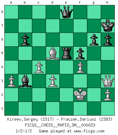 Last move : 1/2-1/2 2020 August 22 19:40:31 [Event "FICGS__CHESS__RAPID_SM__000023"] [Site "FICGS"] [Date "2020.06.21"] [Round "1"] [White "Kireev,Sergey"] [Black "Fraczek,Dariusz"] [Result "1/2-1/2"] [WhiteElo "2317"] [BlackElo "2383"] 1.Nf3 d5 2.g3 Nf6 3.Bg2 c5 4.O-O e6 5.c4 d4 6.e3 Nc6 7.d3 Bd6 8.exd4 cxd4 9.Nbd2 O-O 10.Ng5 a5 11.f4 h6 12.Nge4 Nxe4 13.Nxe4 Be7 14.Bd2 f5 15.Nf2 Bd7 16.Re1 Qc7 17.Rc1 a4 18.a3 Ra6 19.Rb1 Rb8 20.Qh5 Kh7 21.g4 g6 22.Qh3 Rg8 23.gxf5 exf5 24.Qg3 Qd8 25.b4 axb3 26.Rxb3 Bh4 27.Qh3 b6 28.Bd5 Re8 29.Rxe8 Bxe8 30.Nh1 Ra7 31.Ng3 Rg7 32.Ne2 Bf6 33.Be1 Ne7 34.Bg2 Nc6 35.Bd5 Na5 36.Rb1 Ba4 37.Bf2 Nb3 38.Rxb3 Bxb3 39.Nxd4 Bxd4 40.Bxd4 Re7 41.Bf6 Re1+ 42.Kf2 Qe8 43.Be5 Rxe5 1/2-1/2 Reti : King's Indian attack (Barcza system) Kingside Castling by player White (move 4) Kingside Castling by player Black (move 9) This chess game ended in a draw. Follow this game move after move (download)No one ever won a game by resigning. (Unknown) Ich verstehe den Grund nicht, warum die Aufteilung in Frauen und Männer überhaupt im Schach besteht. (Judith Polgar) Con o sin el título, Bobby Fischer fue sin lugar a dudas el mas grande jugador de su época. (Burt Hochberg) Le génie consiste à savoir transgresser les règles au moment opportun. (Teichmann) The arrogant army will lose certainly the battle. (Chinese proverb)