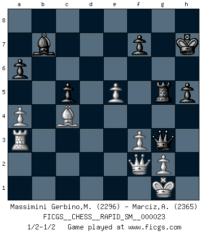 Last move : 1/2-1/2 2020 August 14 21:0:40 [Event "FICGS__CHESS__RAPID_SM__000023"] [Site "FICGS"] [Date "2020.06.21"] [Round "1"] [White "Massimini Gerbino,Massimiliano"] [Black "Marciz,Alexander"] [Result "1/2-1/2"] [WhiteElo "2296"] [BlackElo "2365"] 1.d4 d5 2.Nf3 Nf6 3.c4 e6 4.Nc3 c6 5.Bg5 h6 6.Bh4 dxc4 7.e4 g5 8.Bg3 b5 9.Be2 Bb7 10.O-O Nbd7 11.Ne5 h5 12.Nxd7 Qxd7 13.Qc1 Rg8 14.Rd1 a6 15.h3 g4 16.h4 Bb4 17.Qf4 Rg6 18.a4 Kf8 19.Bf1 Kg8 20.Qe3 Bf8 21.Ne2 Kh7 22.Be5 Bh6 23.Bf4 g3 24.Nxg3 Ng4 25.Qd2 Qd8 26.f3 e5 27.Bxh6 Nxh6 28.Qf2 Qxh4 29.Nf5 Qf4 30.dxe5 Nxf5 31.exf5 Qxf5 32.b3 Rag8 33.bxc4 bxc4 34.Rd6 c5 35.Rxg6 Rxg6 36.Bxc4 Rg5 37.Ra3 Qf4 38.Qe3 Qg3 39.Qf2 1/2-1/2 Queen's pawn game Kingside Castling by player White (move 10) This chess game ended in a draw. Follow this game move after move (download)In Chess, just as in life, today's bliss may be tomorrow's poison. (Assaic) Der Bart als Geschlechtszeichen mitten im Gesicht ist obszön. Daher gefällt er den Weibern. [Zugegeben, kein Schachzitat, aber unglaublich originell] (Arthur Schopenhauer) Cuando tu no sabes absolutamente que mas hacer, es tiempo de entrar en pánico. (John van der Wiel) On n'a jamais que l'âge auquel on a commence à jouer aux échecs car après on cesse de vieillir. (Capablanca) This is where the fun begins. (Anakin Skywalker in Star Wars ep.3)