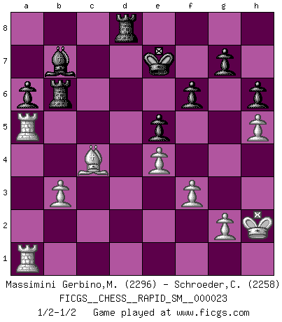 Last move : 1/2-1/2 2020 August 10 3:46:3 [Event "FICGS__CHESS__RAPID_SM__000023"] [Site "FICGS"] [Date "2020.06.21"] [Round "1"] [White "Massimini Gerbino,Massimiliano"] [Black "Schroeder,Christoph"] [Result "1/2-1/2"] [WhiteElo "2296"] [BlackElo "2258"] 1.d4 d5 2.Nf3 e6 3.c4 Nf6 4.Nc3 Be7 5.Bf4 O-O 6.e3 b6 7.Bd3 c5 8.O-O dxc4 9.Bxc4 cxd4 10.Nxd4 Bb7 11.Ncb5 Nc6 12.Nd6 Bxd6 13.Nxc6 Bxc6 14.Qxd6 Qxd6 15.Bxd6 Rfd8 16.Be5 Nd5 17.Rfc1 Bb7 18.a3 Rac8 19.e4 Ne7 20.f3 Nc6 21.Bg3 Kf8 22.a4 Ke7 23.Be1 f6 24.a5 Nxa5 25.Bb4+ Kf7 26.Bxa5 bxa5 27.Rxa5 a6 28.b3 Rc6 29.Rca1 Rb6 30.h4 Ke7 31.Kh2 e5 32.h5 h6 1/2-1/2 Queen's pawn game Kingside Castling by player Black (move 5) Kingside Castling by player White (move 8) This chess game ended in a draw. Follow this game move after move (download)Tactics flow from a superior position. (Bobby Fischer) Die Arbeit ist etwas Unnatürliches. Die Faulheit allein ist göttlich. (Anatole France) En la vida, como en el Ajedrez, los Peones propios obstruyen nuestro camino. La gran fortuna de un hombre, su comodidad, placer, hijos, libros, que deberían ayudarle a ganar, con mucha frecuencia lo ponen en Jaque Mate. (Charles Buxton) Un millionnaire : 'Monsieur Steinitz ! Vous ne participez aux tournois que pour l'argent, alors que moi je n'y viens que pour l'honneur.' Steinitz : 'Chacun joue pour ce qu'il n'a pas'... It's not a bug - it's an undocumented feature. (Anonymous)
