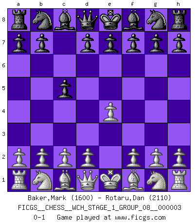 Last move : 0-1 2007 August 12 3:19:15 [Event "FICGS__CHESS__WCH_STAGE_1_GROUP_08__000003"] [Site "FICGS"] [Date "2007.07.11"] [Round "1"] [White "Baker,Mark"] [Black "Rotaru,Dan"] [Result "0-1"] [WhiteElo "1600"] [BlackElo "2110"] 1.e4 c5 0-1 This chess game has been lost on time (started : 2007.07.11 17:0:48) Sicilian defense Player Black won this chess game. Follow this game move after move (download)We must make sure that Chess will not be like a dead language, very interesting, but for a very small group. (Sytze Faber) Frage: Gibt es etwas was Sie mehr lieben als Autobahnen ohne Tempobegrenzungen? - Antwort: Deutsche Frauen ohne Tempobegrenzungen. (Loek van Wely) Jugadores de primera clase pierden en contra de jugadores de segunda clase porque los jugadores de segunda clase a veces juegan una partida de primer clase. (Siegbert Tarrasch) Mais n'est-ce pas déjà le limiter injurieusement que d'appeler les échecs un jeu? N'est-ce pas aussi une science, un art, ou quelque chose qui, comme le cercueil de Mahomet entre ciel et terre, est suspendu entre l'un et l'autre, et qui réunit un nombre incroyable de contraires ? (Stefan Zweig) To err is human, to shift the blame on someone else is tactical. (Mladen Jankovic)