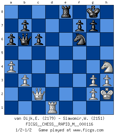 Last move : 1/2-1/2 2020 August 27 3:37:6 [Event "FICGS__CHESS__RAPID_M__000116"] [Site "FICGS"] [Date "2020.06.21"] [Round "1"] [White "van Dijk,Erik L."] [Black "Slawomir,Weglicki"] [Result "1/2-1/2"] [WhiteElo "2179"] [BlackElo "2151"] 1.d4 d5 2.c4 c6 3.Nf3 Nf6 4.Nc3 e6 5.e3 Nbd7 6.Qc2 Bd6 7.Bd3 O-O 8.O-O dxc4 9.Bxc4 a6 10.e4 e5 11.Rd1 Qc7 12.h3 exd4 13.Nxd4 Re8 14.a4 Nc5 15.Nf3 h6 16.Bxh6 Be6 17.Rxd6 Qxd6 18.e5 Qf8 19.Bxe6 Rxe6 20.Be3 Nh7 21.Rd1 Qe7 22.Ne2 Nd7 23.Ng3 Nxe5 24.Nd4 Rg6 25.Ndf5 Qe6 26.b3 Re8 27.Nd4 Nf3+ 28.Nxf3 Rxg3 29.fxg3 Qxe3+ 30.Kh2 Qb6 31.Nh4 Nf6 1/2-1/2 QGD Slav : 4.Nc3 Kingside Castling by player Black (move 7) Kingside Castling by player White (move 8) This chess game ended in a draw. Follow this game move after move (download)I like the moment when I break a man's ego. (Bobby Fischer) Das Schachspiel hat wie die Liebe, die Musik, die Fähigkeit, den Menschen glücklich zu machen. Ich habe ein leises Gefühl des Bedauerns für jeden, der das Schachspiel nicht kennt, so wie ich jeden bedaure, der die Liebe nicht kennt. (Siegbert Tarrasch) Ser exitoso en el Ajedrez te permite descubrir tu propia personalidad. Eso es lo que deseo para los niños de mi clase. (Saudin Robovic) J'apprécie les joueurs d'est-indienne, c'est grâce à eux que je nourris ma famille depuis tant d'années. (Petrosian) A generalist learns less and less about more and more until he knows nothing about everything. (Author unknown)