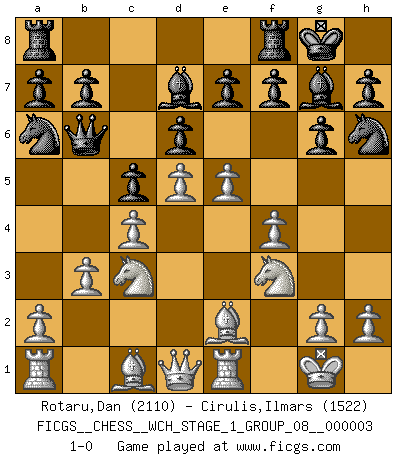 Last move : 1-0 2007 August 27 5:50:44 [Event "FICGS__CHESS__WCH_STAGE_1_GROUP_08__000003"] [Site "FICGS"] [Date "2007.07.11"] [Round "1"] [White "Rotaru,Dan"] [Black "Cirulis,Ilmars"] [Result "1-0"] [WhiteElo "2110"] [BlackElo "1522"] 1.d4 Nf6 2.c4 c5 3.d5 d6 4.Nc3 Bf5 5.f3 g6 6.e4 Bd7 7.f4 Bg7 8.e5 Ng8 9.Nf3 Nh6 10.Be2 Na6 11.O-O O-O 12.Re1 Qb6 13.b3 1-0 This chess game has been lost on time (started : 2007.07.11 17:0:48) Benoni defense, Hromodka system Kingside Castling by player White (move 11) Kingside Castling by player Black (move 11) Player White won this chess game. Follow this game move after move (download)Whoever sees no other aim in the game than that of giving checkmate to one's opponent will never become a good Chess player. (Euwe) Wenn ich Weiß habe gewinne ich weil ich Weiß habe, wenn ich Schwarz habe gewinne ich weil ich Bogoljubov bin. (Efim Bogoljubov) Yo no le temo a Spassky. Todos saben que yo soy el mejor. Uno no necesita un torneo para probarlo. (Bobby Fischer) Vous m'avez demandé de vous exposer quel est le fondement de la prière. Je ne fais que préparer les pièces du jeu sur la table... Nous sera-t-il permis d'en adopter les règles et si nous les appliquons scrupuleusement nous ne tarderons pas à faire mat le Roi divin ! Il ne pourra échapper à nos mains. (Sainte Thérèse d'Avila, Chemin de perfection) For peace of mind, resign as general manager of the universe. (Douglas Adams)