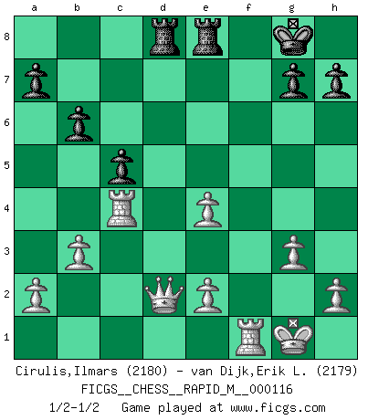 Last move : 1/2-1/2 2020 August 23 21:12:38 [Event "FICGS__CHESS__RAPID_M__000116"] [Site "FICGS"] [Date "2020.06.21"] [Round "1"] [White "Cirulis,Ilmars"] [Black "van Dijk,Erik L."] [Result "1/2-1/2"] [WhiteElo "2180"] [BlackElo "2179"] 1.c4 Nf6 2.Nc3 e5 3.Nf3 Nc6 4.g3 Bb4 5.Nd5 e4 6.Nh4 O-O 7.Bg2 Re8 8.f3 Nxd5 9.cxd5 Be7 10.dxc6 Bxh4 11.cxd7 Bxd7 12.fxe4 c5 13.b3 Bf6 14.Rb1 Bd4 15.Bb2 Bc6 16.Bxd4 Qxd4 17.d3 f5 18.Rc1 Rad8 19.Rc4 Qd7 20.Qc2 fxe4 21.Bxe4 Bxe4 22.dxe4 b6 23.O-O Qd2 24.Qxd2 1/2-1/2 English Opening Kingside Castling by player Black (move 6) Kingside Castling by player White (move 23) This chess game ended in a draw. Follow this game move after move (download)We must make sure that Chess will not be like a dead language, very interesting, but for a very small group. (Sytze Faber) Wie ich sie so einen nach dem anderen nieder mähte wurde meine Überlegenheit offensichtlich. (José Raúl Capablanca) Nos gusta pensar. (Gary Kasparov) Les échecs c'est le défi de l'alpiniste, toujours plus haut, prêt à tout pour monter à l'assaut du Roi ennemi. Les échecs, c'est de la musique en mouvement, un ballet majestueux pour les yeux. C'est de la poésie composée par les fantômes du passé qui au même titre que Rimbaud ou Verlaine méritent notre admiration. Les échecs, c'est de la peinture ou le moindre mouvement modifie le tableau pour en faire un Picasso ou un Van Gogh. Les échecs, c'est tout et rien, c'est la vie et la mort. Jjulie33 sur le forum de France-Echecs. To err is human, but to really foul things up requires a computer. (Farmer's Almanac, 1978)