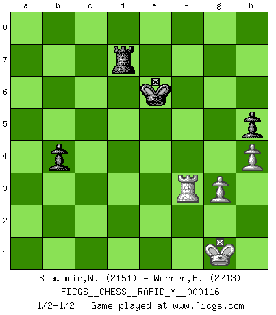 Last move : 1/2-1/2 2020 October 5 21:56:0 [Event "FICGS__CHESS__RAPID_M__000116"] [Site "FICGS"] [Date "2020.06.21"] [Round "1"] [White "Slawomir,Weglicki"] [Black "Werner,Frank-Karl"] [Result "1/2-1/2"] [WhiteElo "2151"] [BlackElo "2213"] 1.e4 e5 2.Nc3 Nc6 3.f4 exf4 4.d4 Qh4+ 5.Ke2 b6 6.Nb5 Ba6 7.a4 O-O-O 8.Nf3 Qe7 9.Kf2 Bb7 10.a5 g5 11.axb6 axb6 12.Bd3 Nf6 13.Re1 g4 14.Bxf4 gxf3 15.Qxf3 Ne8 16.Kg1 Rg8 17.c3 Kb8 18.b4 Rg6 19.Qf2 Bh6 20.Bg3 Rxg3 21.Qxg3 Qg5 22.Qxg5 Bxg5 23.g3 f5 24.h4 Bh6 25.exf5 Nf6 26.Bc4 Rh8 27.d5 Nd8 28.Rad1 Ng4 29.d6 c6 30.Na3 b5 31.Bb3 Be3+ 32.Kg2 h5 33.Kf3 Bh6 34.Re7 Bf8 35.Rde1 Nf6 36.Kf2 Ba6 37.Kg2 Bb7 38.Ba2 Bh6 39.R7e2 Bc8 40.c4 bxc4 41.Nxc4 Bf8 42.Bb3 Bb7 43.Re7 Bxe7 44.dxe7 Nf7 45.Ne5 c5 46.Kg1 Nxe5 47.Rxe5 cxb4 48.Bf7 Kc7 49.e8Q Nxe8 50.Bxe8 Kd6 51.Re2 Bf3 52.Rd2+ Ke5 53.Bxd7 Rd8 54.f6 Kxf6 55.Rf2 Rxd7 56.Rxf3+ Ke6 1/2-1/2 Vienna : Steinitz gambit, Fraser-Minckwitz variation Queenside Castling by player Black (move 7) Promotion Queen by player White (move 49) 10 pieces endgame at move 54 : White KRBPP , Black KRBPP WHITE : King + 1 Rook 1 Bishop 2 Pawns BLACK : King + 1 Rook 1 Bishop 2 Pawns 9 pieces endgame at move 55 : White KRPP , Black KRBPP WHITE : King + 1 Rook 2 Pawns BLACK : King + 1 Rook 1 Bishop 2 Pawns 8 pieces endgame at move 56 : White KRPP , Black KRPP WHITE : King + 1 Rook 2 Pawns BLACK : King + 1 Rook 2 Pawns This chess game ended in a draw. Follow this game move after move (download)Nonsense was the last thing Fischer was interested in, as far as Chess was concerned. (Elie Agur) Was ist der Unterschied zwischen einem Strassenarbeiter und einem Schachspieler? --Der Schachspieler bewegt sich ab und zu. (Anonymous) Dios mío, Bobby Fischer juega tan simple. (Alexei Suetin) Les Echecs sont et restent toujours un combat, un combat intégral comme la boxe, la lutte ou un autre sport, et où il doit y avoir un vainqueur et un vaincu. (Joseph Emil Diemer) CHESS, n. f. [echecs, Fr.] A nice and abstruse game, in which two sets of puppets are moved in opposition to each other. (Dr Samuel Johnson, A Dictionary Of The English Language, 1755)