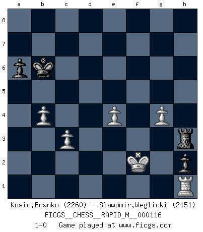 Last move : 1-0 2020 October 9 20:57:7 [Event "FICGS__CHESS__RAPID_M__000116"] [Site "FICGS"] [Date "2020.06.21"] [Round "1"] [White "Kosic,Branko"] [Black "Slawomir,Weglicki"] [Result "1-0"] [WhiteElo "2260"] [BlackElo "2151"] 1.e4 g6 2.d4 Bg7 3.Nc3 d6 4.Be3 a6 5.Qd2 Nd7 6.h4 h5 7.Nh3 b5 8.Ng5 e6 9.a3 Bb7 10.O-O-O Ngf6 11.Be2 Qe7 12.f3 Nb6 13.Kb1 Nfd7 14.Rhf1 O-O-O 15.Bf2 f6 16.Nh3 Bh6 17.Qe1 Rdg8 18.Bg1 f5 19.e5 Kb8 20.exd6 Qxd6 21.Ng5 Bxg5 22.hxg5 Re8 23.Qh4 Rc8 24.Bh2 Qe7 25.Rc1 Rhe8 26.Rfe1 Ka8 27.Bd3 c5 28.dxc5 Qxc5 29.Rcd1 e5 30.Bg1 Qf8 31.Bf1 Kb8 32.Re3 Re6 33.Red3 Qe7 34.Qe1 Nc5 35.R3d2 f4 36.Bd3 Nxd3 37.Rxd3 Qxg5 38.Bxb6 Rxb6 39.R1d2 h4 40.Rd7 Rc7 41.Ne4 Bxe4 42.Rd8+ Rc8 43.Rxc8+ Kxc8 44.Qxe4 Qf6 45.Qa8+ Rb8 46.Qd5 Rb7 47.Qg8+ Kc7 48.Qe8 Kb6 49.b4 g5 50.Rd5 Ka7 51.Rd8 Rc7 52.Ra8+ Kb6 53.a4 bxa4 54.Qxa4 Kb7 55.Qe8 Kb6 56.Qb8+ Rb7 57.Qc8 Qe7 58.c3 g4 59.fxg4 f3 60.gxf3 Qd6 61.Kc2 Qg6+ 62.Kd2 Qd6+ 63.Ke2 e4 64.fxe4 h3 65.Qd8+ Qxd8 66.Rxd8 Rh7 67.Rd1 h2 68.Rh1 Rh3 69.Kf2 1-0 Robatsch (Modern) defense Queenside Castling by player White (move 10) Queenside Castling by player Black (move 14) 10 pieces endgame at move 66 : White KRPPPP , Black KRPP WHITE : King + 1 Rook 4 Pawns BLACK : King + 1 Rook 2 Pawns Player White won this chess game. Follow this game move after move (download)A good sacrifice is one that is not necessarily sound but leaves your opponent dazed and confused. (Rudolph Spielmann) Nicht daß Diemer aus Opportunismus Mitglied der NSDAP geworden wäre. Er war ein Fanatiker, in allem, was er tat. (Hans Ree) En la vida, como en el Ajedrez, los Peones propios obstruyen nuestro camino. La gran fortuna de un hombre, su comodidad, placer, hijos, libros, que deberían ayudarle a ganar, con mucha frecuencia lo ponen en Jaque Mate. (Charles Buxton) La tactique, c'est ce que vous faites quand il y a quelque chose à faire; la stratégie, c'est ce que vous faites quand il n'y a rien à faire. (Savielli Tartacower) I don't believe in psychology. I believe in good moves. (Bobby Fischer)