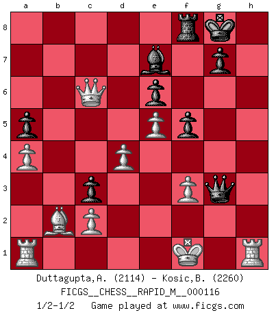 Last move : 1/2-1/2 2020 November 28 9:31:20 [Event "FICGS__CHESS__RAPID_M__000116"] [Site "FICGS"] [Date "2020.06.21"] [Round "1"] [White "Duttagupta,Aniruddha"] [Black "Kosic,Branko"] [Result "1/2-1/2"] [WhiteElo "2114"] [BlackElo "2260"] 1.e4 c5 2.Nf3 Nc6 3.Bb5 e6 4.Bxc6 bxc6 5.d3 Ne7 6.Qe2 d6 7.e5 Nf5 8.O-O d5 9.b3 Be7 10.Bb2 O-O 11.Nbd2 a5 12.a4 Ba6 13.g4 Nd4 14.Nxd4 cxd4 15.Bxd4 Qc7 16.h3 c5 17.Bc3 h6 18.f3 Rfc8 19.Kh2 Bb7 20.Rab1 c4 21.bxc4 dxc4 22.d4 Bd5 23.Ne4 Rf8 24.Kg2 Bc6 25.Ra1 Bd5 26.Be1 Rab8 27.Nc3 Bc6 28.Bf2 Rb4 29.h4 Qd8 30.Rh1 f5 31.g5 Qe8 32.Be1 Qg6 33.Nb5 hxg5 34.hxg5 Rb2 35.Bc3 Qxg5+ 36.Kf1 Bxb5 37.Bxb2 c3 38.Qxb5 Qg3 39.Qc6 1/2-1/2 Follow this game move after move (download)You sit at the board and suddenly your heart leaps. Your hand trembles to pick up the piece and move it. But what Chess teaches you is that you must sit there calmly and think about whether it's really a good idea and whether there are other better ideas. (Stanley Kubrick) Nur ein wirklich starker Spieler weiß wie schwach er spielt. (Savielly Grigorievitsch Tartakower) Con el fin de mejorar tu juego, debes de estudiar los finales antes que todo, ya que mientras que los finales pueden ser estudiados y dominados por sí mismos, el juegomedio y la apertura deben de ser estudiados en relación con los finales. (José Raúl Capablanca) Soyez une menace à chaque fois que vous vous asseyez pour jouer. (Ken Smith) Vladimir Ras-Putin is still alive... He is also a good actor, I saw him in the Lord of the Rings. (Rodolfo d'Ettorre)