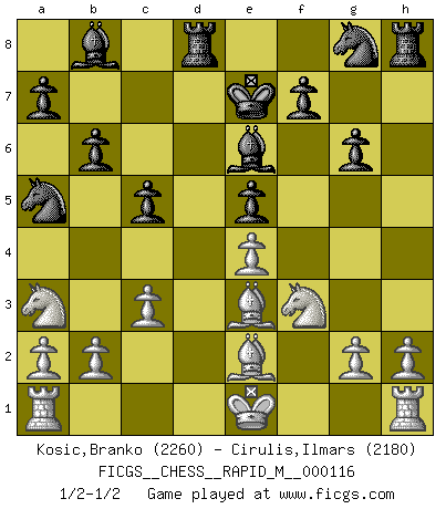 Last move : 1/2-1/2 2020 August 6 21:16:25 [Event "FICGS__CHESS__RAPID_M__000116"] [Site "FICGS"] [Date "2020.06.21"] [Round "1"] [White "Kosic,Branko"] [Black "Cirulis,Ilmars"] [Result "1/2-1/2"] [WhiteElo "2260"] [BlackElo "2180"] 1.e4 c5 2.Be2 Nc6 3.f4 d5 4.d3 dxe4 5.dxe4 Qxd1+ 6.Bxd1 e5 7.Nc3 Bd6 8.f5 g6 9.fxg6 hxg6 10.Nf3 Be6 11.Nb5 Rd8 12.c3 Bb8 13.Be3 b6 14.Na3 Ke7 15.Be2 Na5 1/2-1/2 Sicilian defense This chess game ended in a draw. Follow this game move after move (download)The hardest game to win is a won game. (Emanuel Lasker) In Buenos Aires ist es nicht mein vorrangiges Ziel ein starkes Turnier zu organisieren, sondern ein Turnier für Gentlemen. Ich würde nie Kamsky einladen. Ich mag keine Probleme. (Miguel Najdorf) ¡Examina movidas que hagan daño! Un buen ojo for movidas desvastantes es mucho mas importante que el conocimiento de principios estratégicos. (Purdy) Aux échecs, l'amour-propre est satisfait quand on remporte la victoire, mais il n'y a pas de honte à être battu. (Benjamin Franklin) If things go wrong, don't go with them. (Roger Babson)