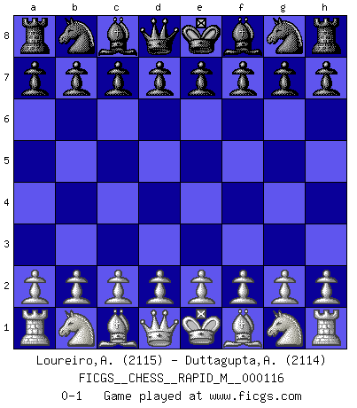 Last move : 0-1 2020 July 22 1:7:18 [Event "FICGS__CHESS__RAPID_M__000116"] [Site "FICGS"] [Date "2020.06.21"] [Round "1"] [White "Loureiro,Anderson"] [Black "Duttagupta,Aniruddha"] [Result "0-1"] [WhiteElo "2115"] [BlackElo "2114"] 0-1 This chess game has been lost on time (started : 2020.06.21 19:12:8) Player Black won this chess game. Follow this game move after move (download)For me, Chess is life and every game is like a new life. Every Chess player gets to live many lives in one lifetime. (Eduard Gufeld) Ich verstehe Aljechins Kombinationen ganz gut; aber woher er diese Angriffschancen bekommt und wie er die Eröffnung behandelt das ist für mich ein Buch mit sieben Siegeln. (Rudolf Spielmann) No hay otro maestro que tenga una voluntad terrífica de ganar. Al tablero, el irradía peligro y aún los oponentes mas fuertes tienden a congelarse como liebres cuando olfatean a una pantera. Aún sus debilidades son peligrosas. Con las blancas, su juego de apertura es predecible - te es posible hacer planes en su contra - pero es tan fuerte que tus planes casi nunca funcionan. En el juego medio, su precisión e invención son fabulosas y en finales, tú simplemente no le puedes vencer. (Experto Alemán anónimo) Il n'y a pas eu de défaite parce que je ne crois pas que cet ordinateur ait jamais existé. IBM a triché en refusant d'imprimer les modes de recherche de la machine. C'est évident, pendant le match, des coups décisifs ont été joués par des êtres humains. Aujourd'hui, les meilleurs spécialistes en informatique ne peuvent toujours pas expliquer comment Deep-Blue a pu jouer contre la logique des ordinateurs. IBM a gagné une guerre de communication, mais ils sont incapables de prouver que l'ordinateur a gagné tout seul. (Garry Kasparov) At work, the authority of a person is inversely proportional to the number of pens that person is carrying. (Dan Rotaru)