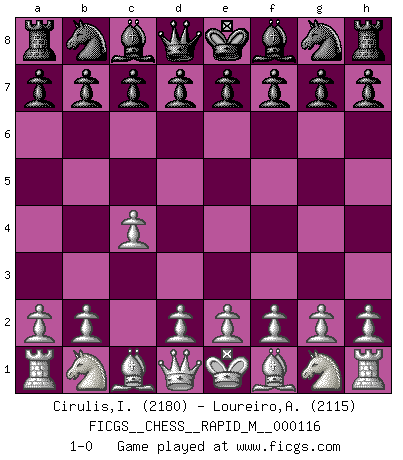 Last move : 1-0 2020 July 22 1:7:18 [Event "FICGS__CHESS__RAPID_M__000116"] [Site "FICGS"] [Date "2020.06.21"] [Round "1"] [White "Cirulis,Ilmars"] [Black "Loureiro,Anderson"] [Result "1-0"] [WhiteElo "2180"] [BlackElo "2115"] 1.c4 1-0 This chess game has been lost on time (started : 2020.06.21 19:12:8) English Opening Player White won this chess game. Follow this game move after move (download)The passed pawn is a criminal, who should be kept under lock and key. Mild measures, such as police surveillance, are not sufficient. (Nimzovitch) Ich verachte Kasparow. (Viktor Kortschnoi) Bobby es la celebridad menos entendida y malinterpretada que camina el la faz de esta tierra. (Yasser Seirawan) Mon pion favori sur ma case favorite ! Bronstein en parlant d'un coup de pion en h5 quand il avait les Noirs. To send light into the darkness of men's hearts - such is the duty of the artist. (Schumann)