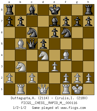 Last move : 1/2-1/2 2020 June 27 22:36:56 [Event "FICGS__CHESS__RAPID_M__000116"] [Site "FICGS"] [Date "2020.06.21"] [Round "1"] [White "Duttagupta,Aniruddha"] [Black "Cirulis,Ilmars"] [Result "1/2-1/2"] [WhiteElo "2114"] [BlackElo "2180"] 1.d4 d5 2.Nf3 Nf6 3.Bf4 c5 4.e3 Nc6 5.Nbd2 Qb6 6.dxc5 Qxb2 7.Rb1 Qc3 8.Bb5 e6 9.O-O Be7 10.Nd4 Qxc5 11.N2b3 Qb6 12.Nd2 Qc5 13.N2b3 1/2-1/2 Queen's Bishop game Kingside Castling by player White (move 9) This chess game ended in a draw. Follow this game move after move (download)My opponents make good moves too. Sometimes I don't take these things into consideration. (Bobby Fischer) Mit Schach schule ich mein Gefühl für Geometrie, was für Tennis und Schach gleichermaßen wichtig ist. (Boris Becker) Un mal plan es mejor que no tener ningún plan. (Frank Marshall) L'attaque fait le spectacle, la défense gagne les matchs. (Dicton footballistique) There is a very easy way to return from a casino with a small fortune : go there with a large one. (Jack Yelton)