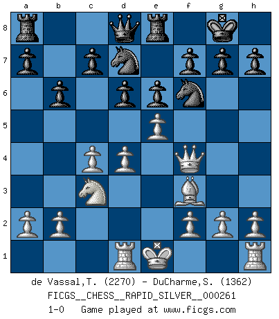 Last move : 1-0 2020 July 19 22:54:50 [Event "FICGS__CHESS__RAPID_SILVER__000261"] [Site "FICGS"] [Date "2020.06.23"] [Round "2"] [White "de Vassal,Thibault"] [Black "DuCharme,Steven"] [Result "1-0"] [WhiteElo "2270"] [BlackElo "1362"] 1.d4 Nf6 2.c4 e6 3.Nf3 Bb4+ 4.Bd2 Bxd2+ 5.Qxd2 b6 6.Nc3 Bb7 7.Qf4 O-O 8.e4 d6 9.Be2 Nbd7 10.Rd1 Re8 11.e5 Bxf3 12.Bxf3 1-0 Bogo-Indian defense Kingside Castling by player Black (move 7) Player White won this chess game. Follow this game move after move (download)Adequate compensation for a sacrifice is having a sound combination leading to a winning position; adequate compensation for a blunder is having your opponent snatch defeat from the jaws of victory. (Bruce A. Moon) Über die Verhaftung Bobby Fischers: Warum es die Bush-Administration für nötig befindet einen 61 Jahre alten Mann zu hetzten, der für niemanden ausser sich selbste eine Gefahr darstellt ist ein Rätsel. (Nigel Short) En la vida, como en el Ajedrez, los Peones propios obstruyen nuestro camino. La gran fortuna de un hombre, su comodidad, placer, hijos, libros, que deberían ayudarle a ganar, con mucha frecuencia lo ponen en Jaque Mate. (Charles Buxton) La tactique est l'élément le plus important du milieu de jeu. (Siegbert Tarrasch) The intuitive mind is a sacred gift; the rational mind is a faithful servant. We have created a society that honors the servant but has forgotten the gift. (Albert Einstein)