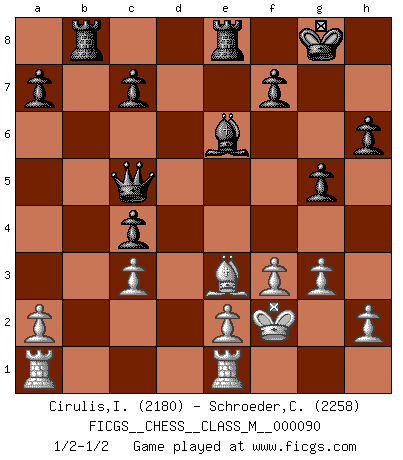 Last move : 1/2-1/2 2020 July 2 20:18:11 [Event "FICGS__CHESS__CLASS_M__000090"] [Site "FICGS"] [Date "2020.06.25"] [Round "1"] [White "Cirulis,Ilmars"] [Black "Schroeder,Christoph"] [Result "1/2-1/2"] [WhiteElo "2180"] [BlackElo "2258"] 1.c4 e6 2.Nf3 d5 3.d4 Nf6 4.g3 Be7 5.Bg2 O-O 6.O-O dxc4 7.Ne5 Nc6 8.Bxc6 bxc6 9.Nxc6 Qe8 10.Nxe7+ Qxe7 11.Qa4 e5 12.dxe5 Qxe5 13.Re1 Be6 14.Nc3 Ne4 15.Qa3 Nxc3 16.bxc3 Bh3 17.f3 g5 18.Qb4 Be6 19.Kf2 Rab8 20.Qe7 h6 21.Be3 Rfe8 22.Qc5 Qxc5 1/2-1/2 English Opening : Agincourt variation Kingside Castling by player Black (move 5) Kingside Castling by player White (move 6) This chess game ended in a draw. Follow this game move after move (download)A thorough understanding of the typical mating continuations makes the most complicated sacrificial combinations leading up to them not only not difficult, but almost a matter of course. (Siegbert Tarrasch) Fallen sollten polizeilich verboten werden. (Savielly Grigorievitsch Tartakower) El Ajedrez es un juego de pelea el cual es puramente intelectual e incluye la suerte. (Richard Reti) Celui qui prend des risques peut perdre, celui qui n'en prend pas perd toujours. (Xavier Tartacover) The beginning of wisdom is silence. The second step is listening. (Unknown)