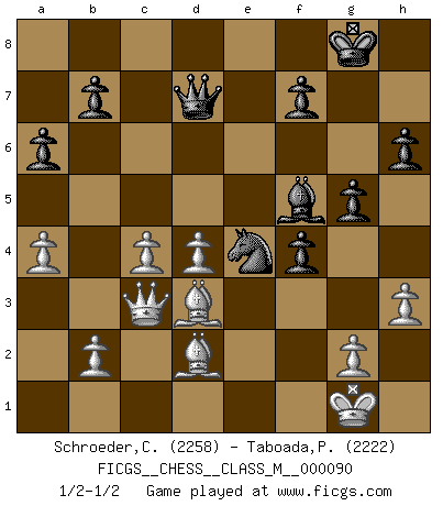 Last move : 1/2-1/2 2020 July 21 1:33:11 [Event "FICGS__CHESS__CLASS_M__000090"] [Site "FICGS"] [Date "2020.06.25"] [Round "1"] [White "Schroeder,Christoph"] [Black "Taboada,Pedro Pablo"] [Result "1/2-1/2"] [WhiteElo "2258"] [BlackElo "2222"] 1.e4 e5 2.f4 exf4 3.Nf3 d5 4.exd5 Nf6 5.Bb5+ c6 6.dxc6 Nxc6 7.d4 Bd6 8.O-O O-O 9.Nbd2 Bg4 10.c3 Re8 11.Bd3 Qd7 12.Qc2 Rac8 13.Qb1 h6 14.Ne4 Nxe4 15.Bxe4 Ne7 16.Bd2 Be6 17.Re1 Nd5 18.a4 Nf6 19.Bd3 a6 20.Ne5 Bxe5 21.Rxe5 g5 22.Qc2 Ng4 23.Re2 Bd5 24.Rae1 Rxe2 25.Rxe2 Re8 26.h3 Rxe2 27.Bxe2 Nf6 28.c4 Be4 29.Qc3 Bf5 30.Bd3 Ne4 1/2-1/2 KGA : Abbazia defense, Modern variation Kingside Castling by player White (move 8) Kingside Castling by player Black (move 8) This chess game ended in a draw. Follow this game move after move (download)I don't believe in psychology. I believe in good moves. (Bobby Fischer) Ein Kibitz ist einer, der deinem Gegner gute Ratschläge gibt. (Andrew Soltis) Botvinnik trataba de restarle el misterio al Ajedrez, siempre relacionandolo a situaciones de la vida ordinaria. El gustaba de llamar al Ajedrez un típico problema inexacto similar a aquellos de los cuales la gente siempre tiene que enfrentarse en la vida cotidiana. (Garry Kasparov) Les Echecs, c'est l'art de la guerre sans les charniers, c'est la résurrection des morts tombés au champ d'honneur, l'espoir perpétuel, la suprématie de l'intelligence sur la force, la culture de l'esprit. (F. Szpiner) They say poker is a zero-sum game. It must be, because every time I play my sum ends up zero. (Max Shapiro)