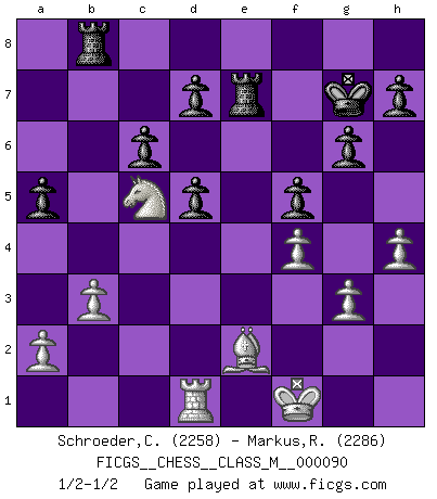 Last move : 1/2-1/2 2020 July 17 6:47:13 [Event "FICGS__CHESS__CLASS_M__000090"] [Site "FICGS"] [Date "2020.06.25"] [Round "1"] [White "Schroeder,Christoph"] [Black "Markus,Roland"] [Result "1/2-1/2"] [WhiteElo "2258"] [BlackElo "2286"] 1.e4 e5 2.Nf3 Nc6 3.d4 exd4 4.Nxd4 Nf6 5.Nxc6 bxc6 6.e5 Qe7 7.Qe2 Nd5 8.c4 Ba6 9.b3 g6 10.g3 Bg7 11.Bb2 O-O 12.Bg2 Rae8 13.O-O Bxe5 14.Bxe5 Qxe5 15.Qxe5 Rxe5 16.cxd5 Bxf1 17.Kxf1 cxd5 18.Nc3 c6 19.Rd1 Rb8 20.Bf3 Rb4 21.Na4 Re7 22.Nc5 f5 23.Be2 a5 24.Na6 Rb6 25.Nc5 Rb8 26.h4 Kg7 27.f4 1/2-1/2 Scotch : Mieses variation Kingside Castling by player Black (move 11) Kingside Castling by player White (move 13) This chess game ended in a draw. Follow this game move after move (download)The hallmark of the artist is simplicity. (Larry Evans) Dieses schreckliche Gefühl, dass ich gegen eine Maschine spielte, die niemals Fehler macht, zerschmetterte meinen Widerstand. (Mark Taimanov) Observen a Garry Kasparov. Después de una derrota, invariablemente el gana la próxima partida. Prácticamente hace pedazos a su siguiente oponente. Eso es algo que tenemos que aprender a lograr. (Maurice Ashley) Je menace de comprendre la position. (Anonyme) Thus, what is of supreme importance in war is to attack the enemy's strategy. (Sun Tzu)
