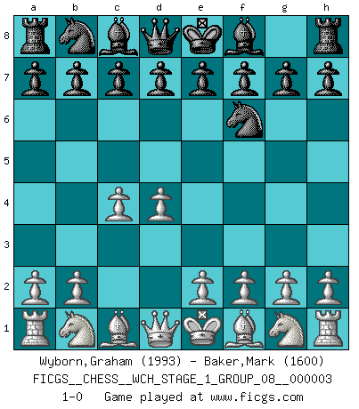 Last move : 1-0 2007 August 12 3:19:15 [Event "FICGS__CHESS__WCH_STAGE_1_GROUP_08__000003"] [Site "FICGS"] [Date "2007.07.11"] [Round "1"] [White "Wyborn,Graham"] [Black "Baker,Mark"] [Result "1-0"] [WhiteElo "1993"] [BlackElo "1600"] 1.d4 Nf6 2.c4 1-0 This chess game has been lost on time (started : 2007.07.11 17:0:48) Queen's pawn game Player White won this chess game. Follow this game move after move (download)Bobby Fischer is the greatest Chess genius of all time ! (Alexander Kotov) Ein Teil des Fehlers ist immer korrekt. (Savielly Grigorievitsch Tartakower) Si tu oponente te ofrece un empate, trata de averiguar porque piensa él que esta en una posición peor. (Nigel Short) Le profane ne songe pas à la somme de jouissance dont il se prive, qui méconnaît ce jeu aux ressources aussi variées que passionnantes. (Jean-Marie Jeanton-Lamarche) No, I am still playing. (Anatoly Karpov)