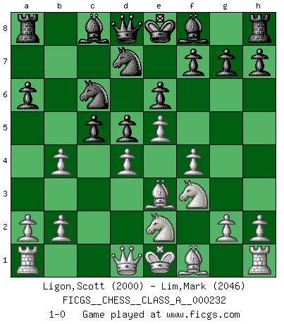 Last move : 1-0 2020 August 8 6:52:45 [Event "FICGS__CHESS__CLASS_A__000232"] [Site "FICGS"] [Date "2020.06.27"] [Round "1"] [White "Ligon,Scott"] [Black "Lim,Mark"] [Result "1-0"] [WhiteElo "2000"] [BlackElo "2046"] 1.e4 e6 2.d4 d5 3.Nc3 Nf6 4.e5 Nfd7 5.f4 c5 6.Nf3 Nc6 7.Be3 a6 8.Ne2 b5 9.c3 b4 10.cxb4 1-0 This chess game has been lost on time (started : 2020.06.27 14:43:15) French : Steinitz, Boleslavsky variation Player White won this chess game. Follow this game move after move (download)The blunders are all there on the board, waiting to be made. (Savielly Tartakover) Es hat in meinem Leben Zeiten gegeben, in denen das Schachspiel, wenn nicht zum Lebenszweck, so doch zu einem regelrechten Lebensersatz geworden ist. Man fühlt sich in solchen Zeiten nicht so, als besäße man eine göttliche Gabe, sondern eher so, als sei man von ihr besessen. (Garry Kasparov) Yo no creo en la psicología. Yo creo en las buenas movidas. (Bobby Fischer) Seul un grand joueur sait à quel point il joue faiblement. (Xavier Tartacover) If you don't practice you don't deserve to win. (Andre Agassi)